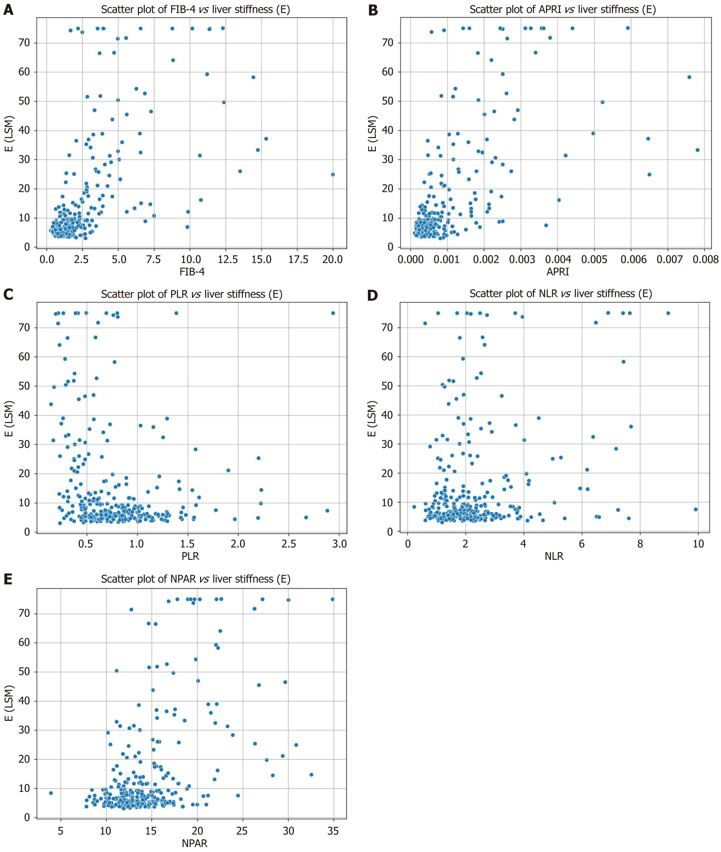 A: Scatter plot demonstrating correlation between fibrosis 4 and liver stiffness measurement; B: Scatter plot demonstrating correlation between aspartate transaminase to platelet ratio index and liver stiffness measurement; C: Scatter plot demonstrating correlation between platelet-to-lymphocyte ratio and liver stiffness measurement; D: Scatter plot demonstrating correlation between neutrophil-lymphocyte ratio and liver stiffness measurement; E: Scatter plot demonstrating correlation between neutrophil percentage-to-albumin ratio and liver stiffness measurement. FIB-4: Fibrosis 4; APRI: Aspartate transaminase to platelet ratio index; LSM: Liver stiffness measurement; E: Elasticity measurement in kilopascals; PLR: Platelet-to-lymphocyte ratio; NLR: Neutrophil-lymphocyte ratio; NPAR: Neutrophil percentage-to-albumin ratio.