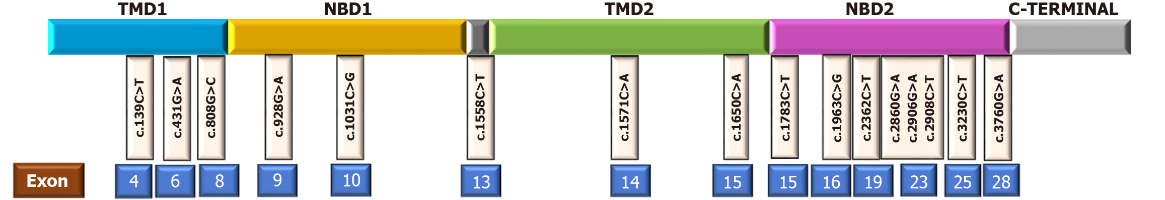 Figure 1 Schematic representation of ABCB4 variants, exons and domains in the present cohort.