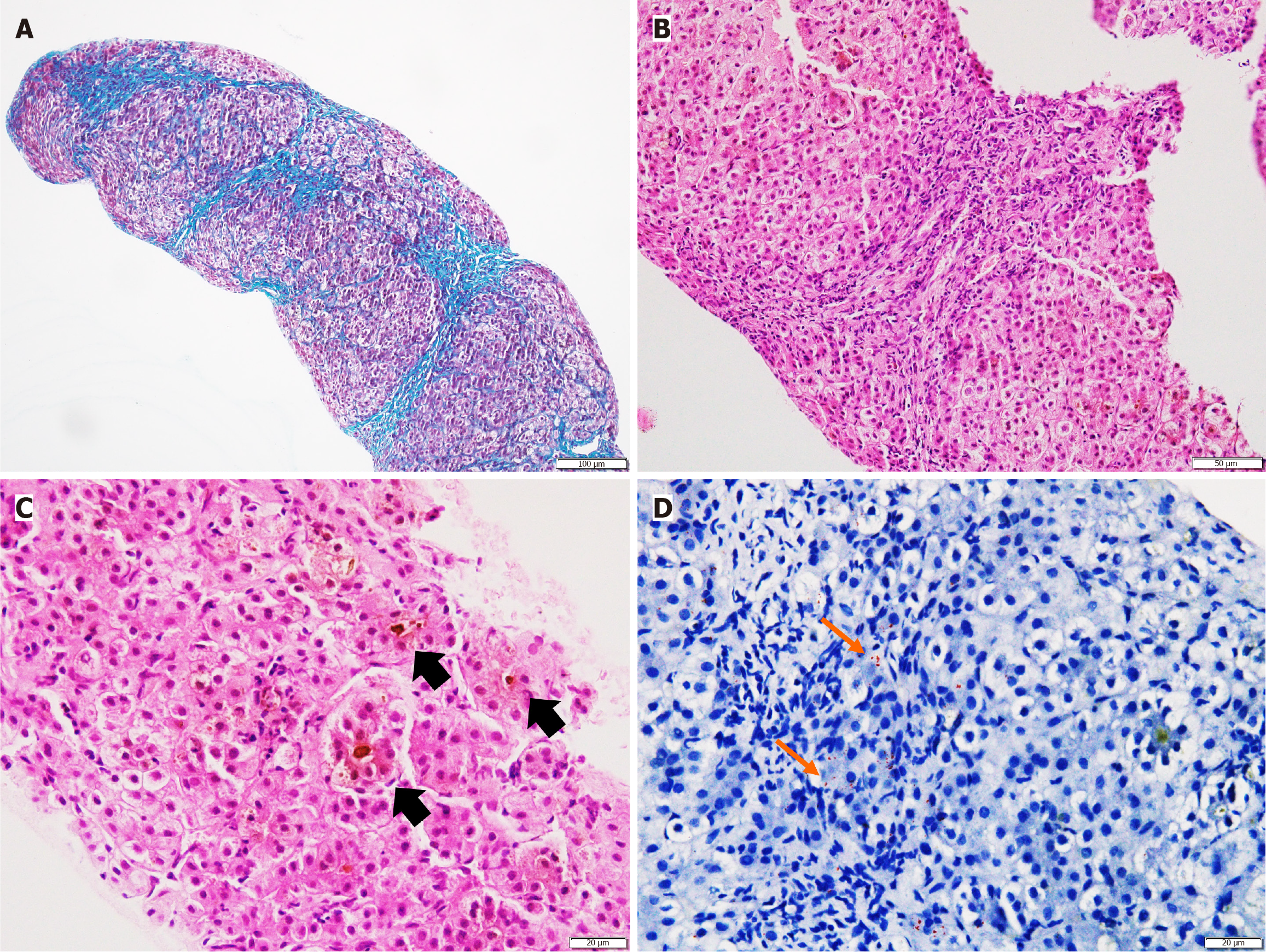 A: The lobular architecture was distorted with porto-portal and occasional slender porto-central bridging fibrosis with the formation of incomplete nodules (masson trichrome, 100 ×); B: The fibrous septa showed variable lymphocytic sprinkling and moderate ductular reaction (hematoxylin and eosin, 200 ×); C: The hepatic lobules showed hepatocanalicular cholestasis and cholestatic rosettes (thick black arrows) (hematoxylin and eosin, 400 ×); D: Periportal/periseptal hepatocytes showed copper retention visualized as tiny red specks (thin orange arrows) (Rhodanine, 400 ×).