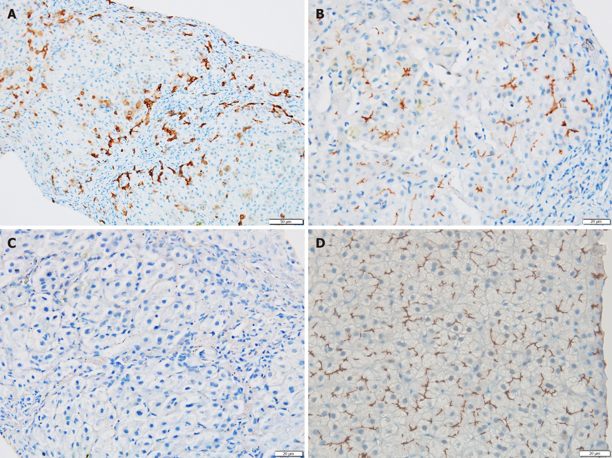 A: CK7 immunostain showed ductular reaction and periseptal to panacinar biliary metaplasia (200 ×); B: Bile salt export pump immunostain showed retained canalicular expression (400 ×); C: Multidrug resistance protein 3 immunostain which showed complete loss of canalicular stain (400 ×); D: A case of primary sclerosing cholangitis (control case) showing retained multidrug resistance protein 3 immunostaining (400 ×).