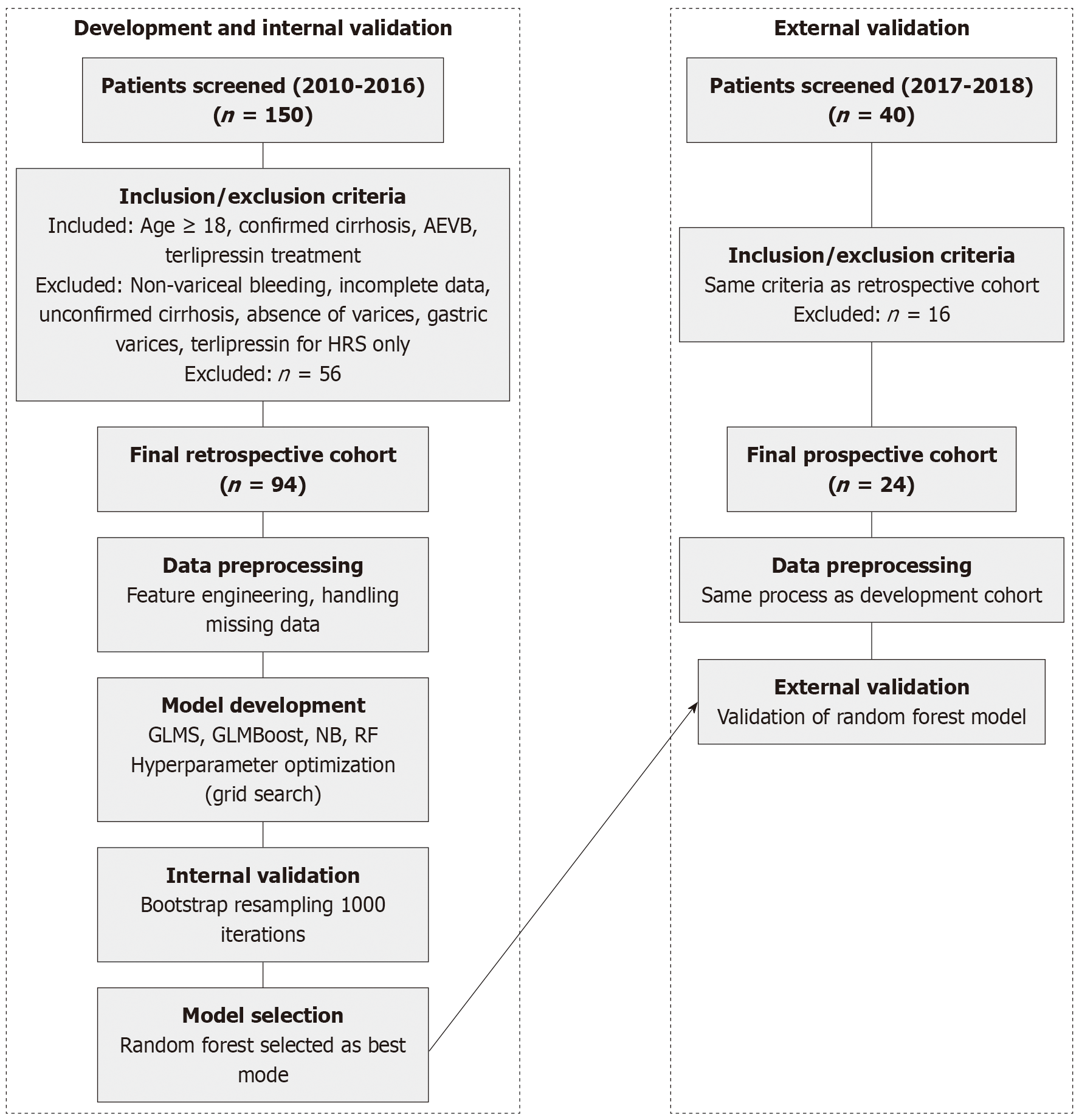 Left panel shows the development and internal validation process (2010-2016), including patient screening, selection criteria, data preprocessing, model development, and validation steps. Right panel demonstrates the external validation process (2017-2018) using an independent prospective cohort. AEVB: Acute esophageal variceal bleeding; GLMs: Generalized linear models; GLMBoost: Generalized linear models with boosting; HRS: Hepatorenal syndrome; NB: Naive Bayes; RF: Random forest.