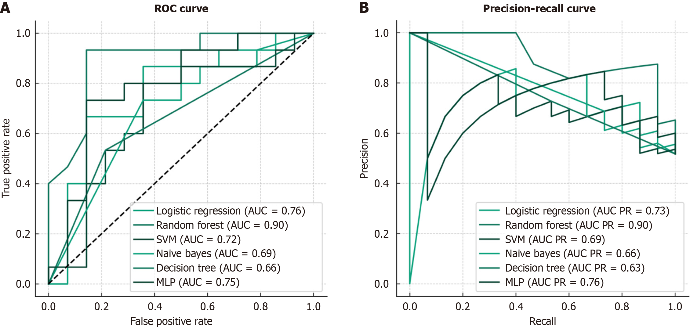 A: Receiver operating characteristic (ROC) curves showing the trade-off between true-positive rate and false-positive rate for each model; B: Precision-recall (PR) curves demonstrating the relationship between precision and recall across different classification thresholds. AUC: Area under the curve; MLP: Multilayer perceptron; SVM: Support vector machine.