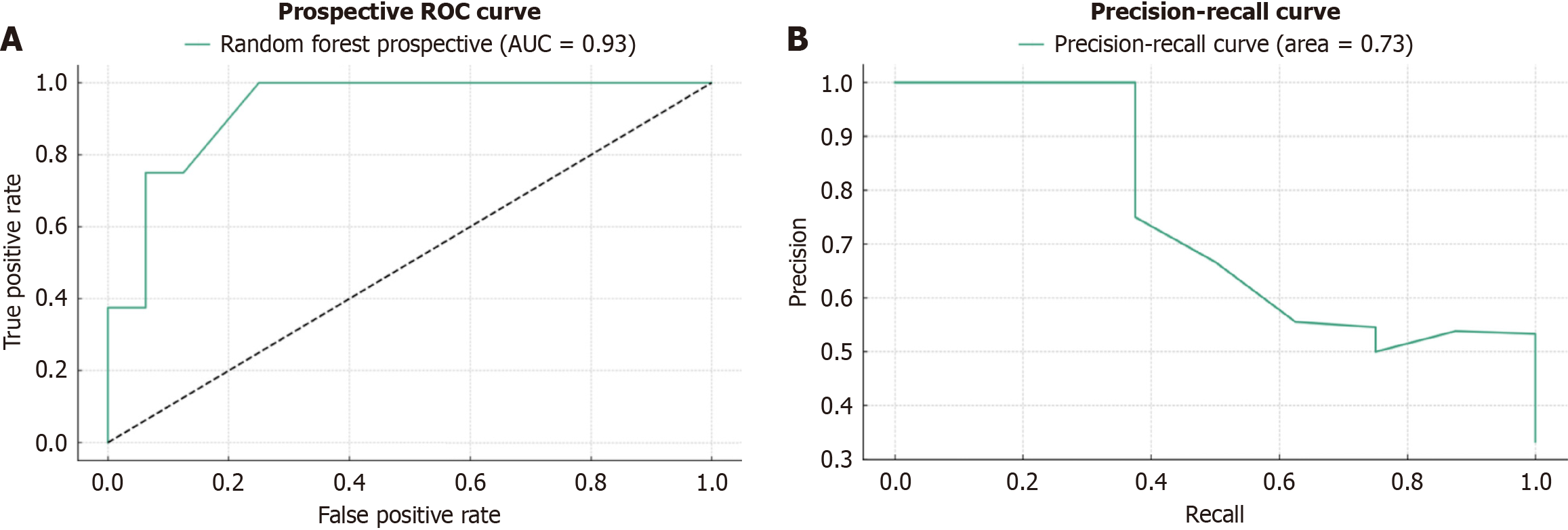 A: Receiver operating characteristic (ROC) curve showing the relationship between true-positive rate and false-positive rate. The dashed line represents random prediction; B: Precision-recall curve demonstrating the model’s predictive performance across different classification thresholds. AUC: Area under the curve.