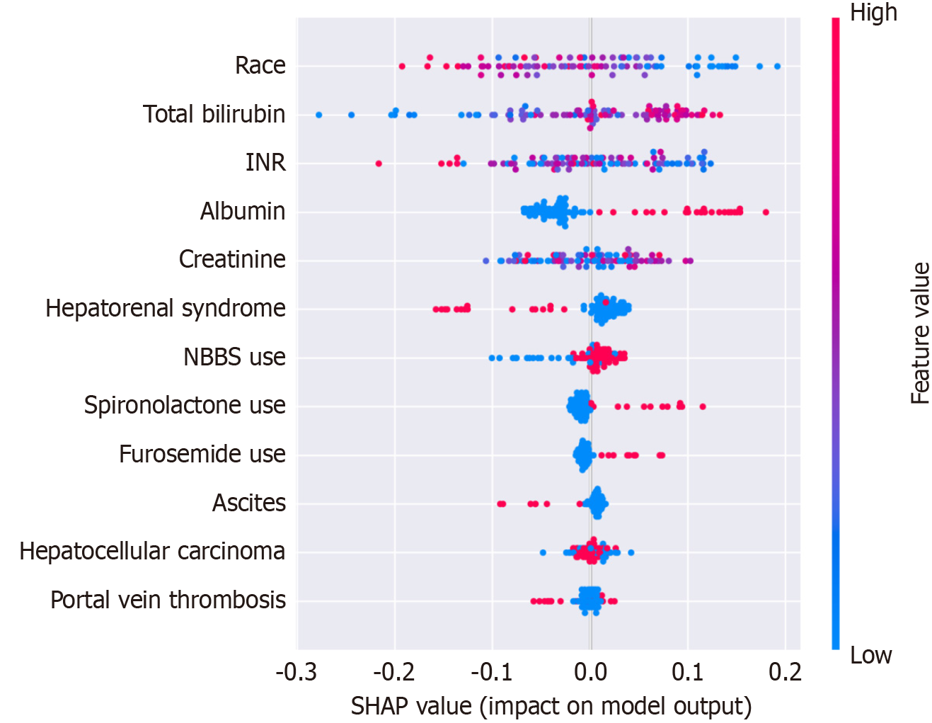 The X-axis represents SHapley Additive exPlanations values, indicating the magnitude and direction of each feature's impact on model output. Each point represents an individual observation, with color intensity indicating the feature value (blue: Low, red: High). Features are ordered by mean absolute SHapley Additive exPlanations value, with race showing the highest overall impact on model predictions. The vertical line at X = 0 represents no effect on model output. INR: International normalized ratio; NBBS: Non-selective beta-blockers; SHAP: SHapley Additive exPlanations.