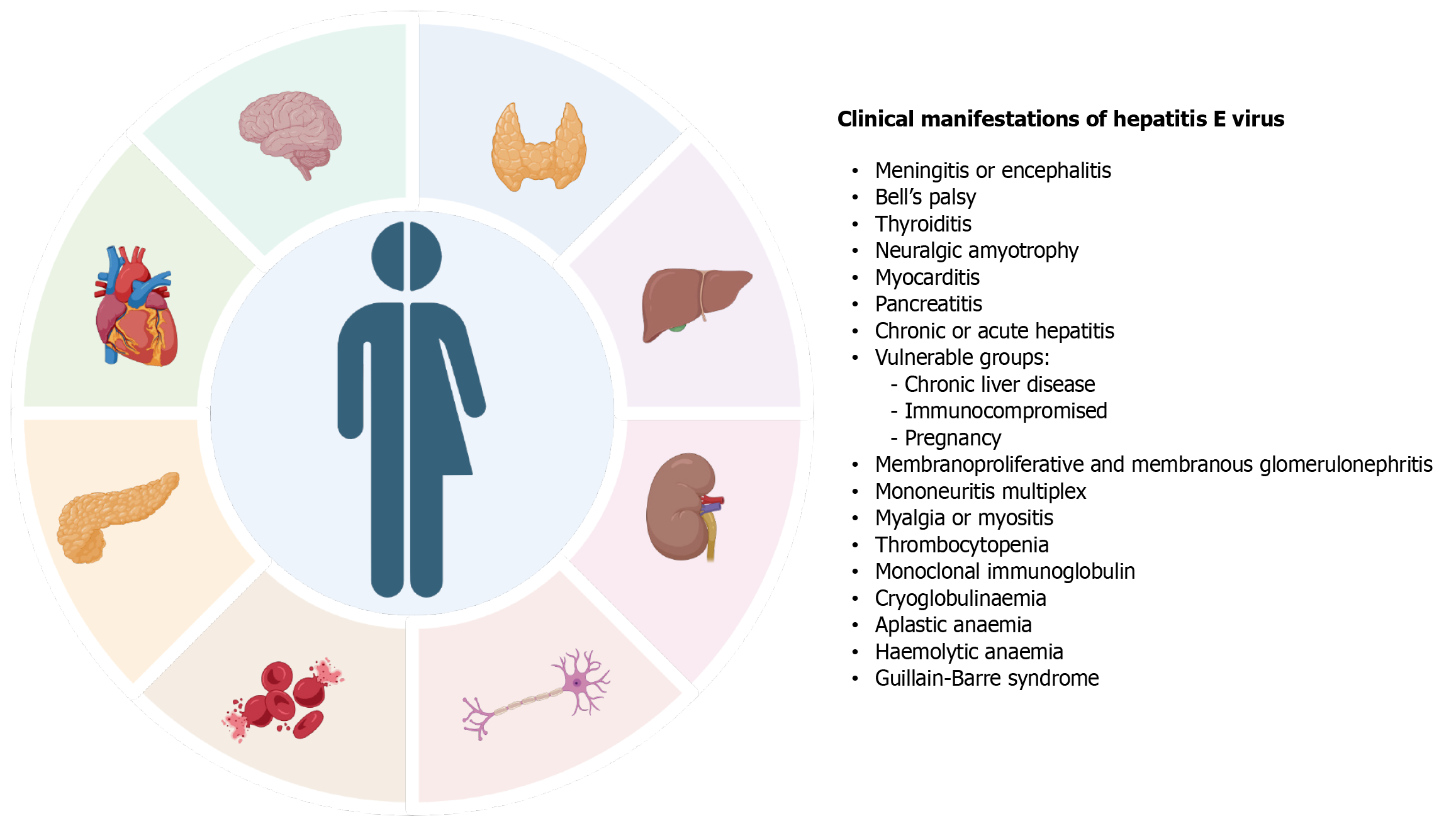 Figure 1 Clinical manifestations of hepatitis E virus infection by organ system, highlighting high-morbidity groups.