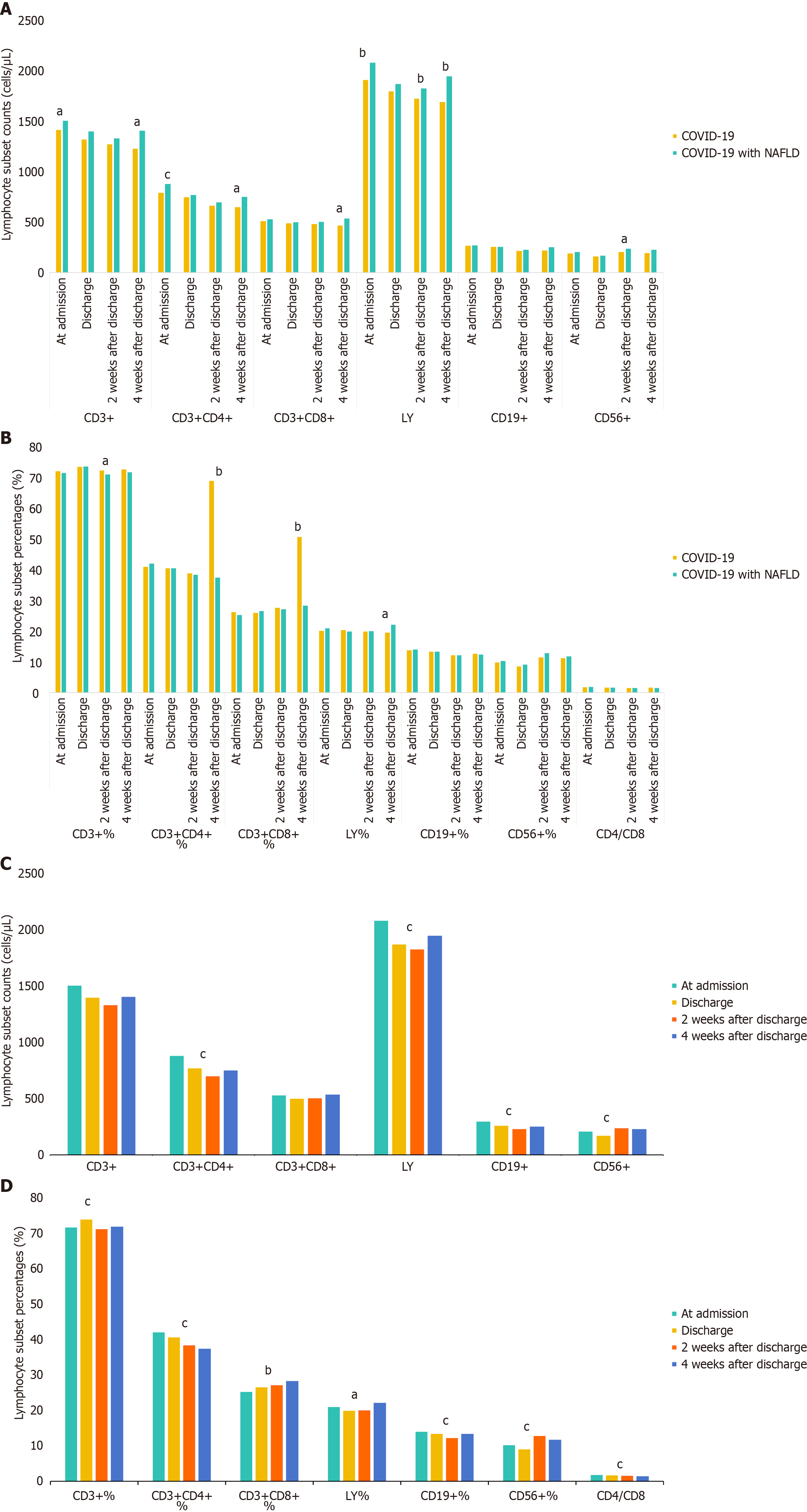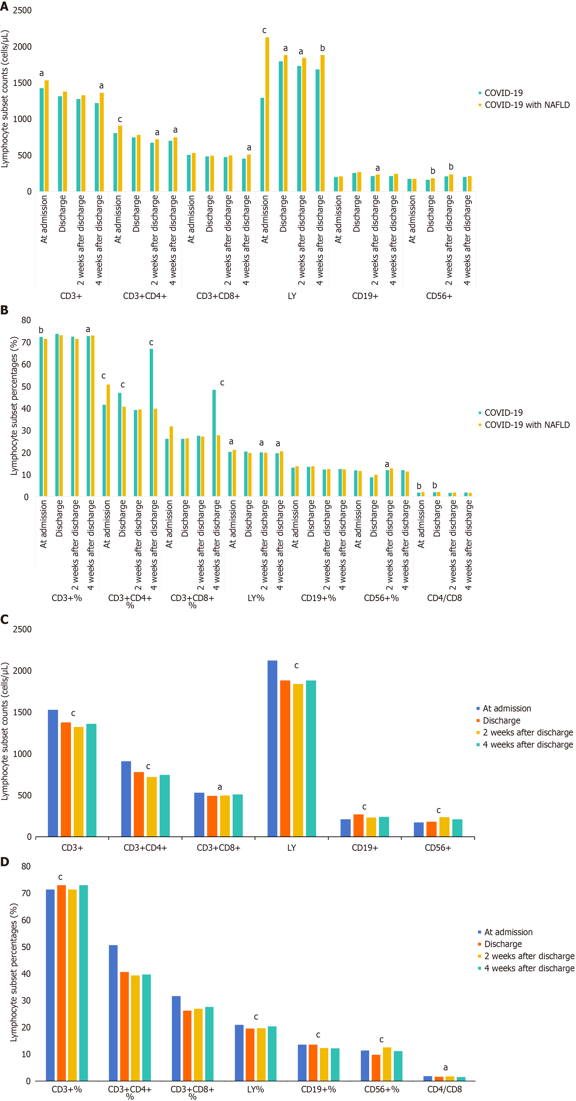 A and B: Comparison between coronavirus disease 2019 (COVID-19) patients with non-alcoholic fatty liver disease and those without; C and D: Comparison across different time points in COVID-19 patients with non-alcoholic fatty liver disease. aP < 0.05; bP < 0.01; cP < 0.001. COVID-19: Coronavirus disease 2019; LY: Lymphocyte counts.