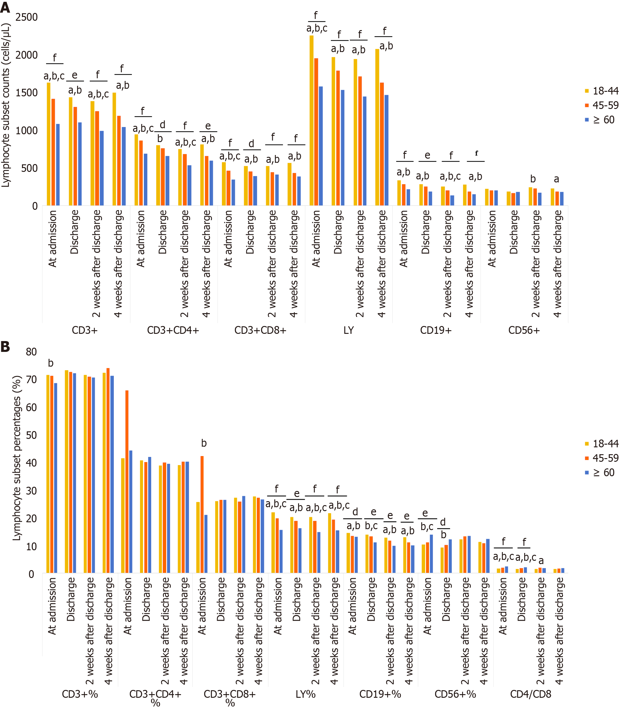 A: Lymphocyte subset counts (cells/μL); B: Lymphocyte subset percentages (%). aP < 0.05, 18-44 years vs 45-59 years; bP < 0.05, 18-44 years vs ≥ 60 years; cP < 0.05, 45-59 years vs ≥ 60 years; dP < 0.05; eP < 0.01; fP < 0.001. LY: Lymphocyte counts.