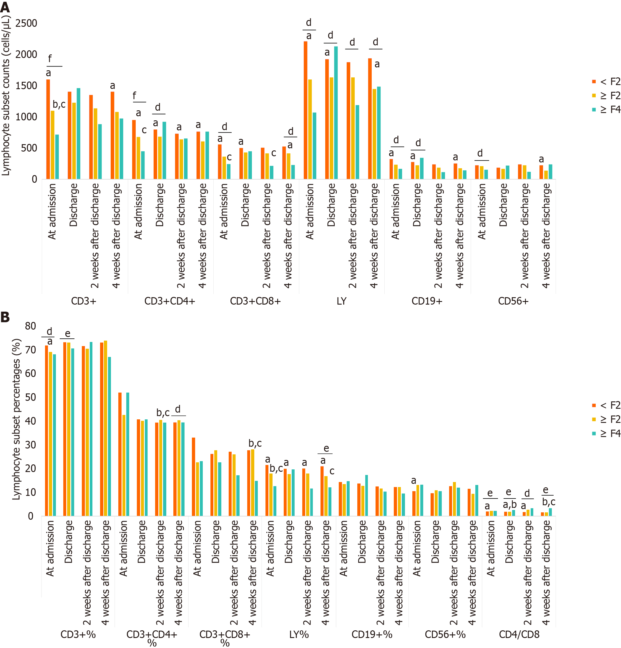 Figure 4 Impact of liver fibrosis on lymphocyte subsets and their percentages in coronavirus disease 2019 patients with non-alcoholic fatty liver disease: A longitudinal analysis from hospital admission to 4 weeks post-discharge.