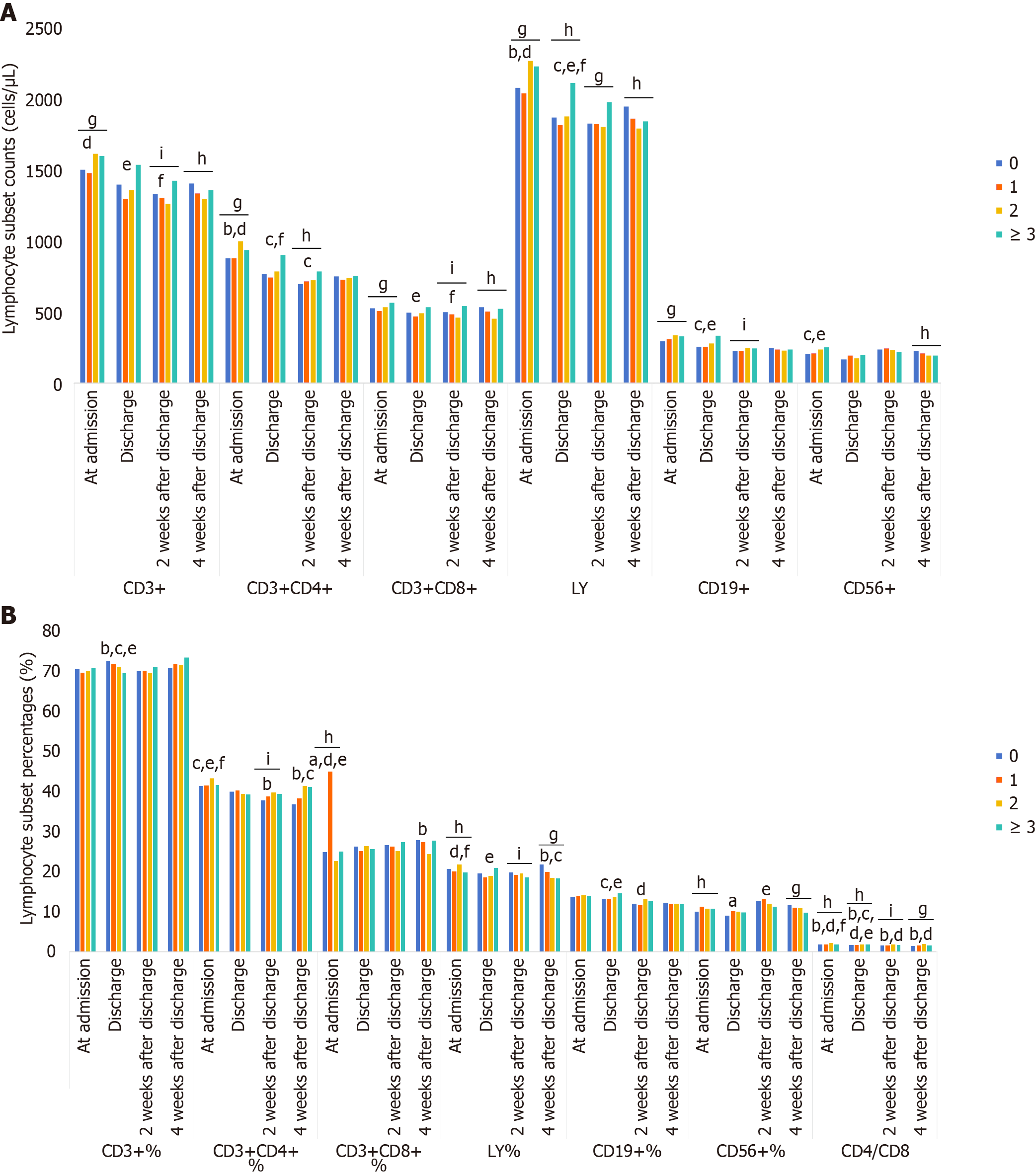 A: Lymphocyte subset counts (cells/μL); B: Lymphocyte subset percentages (%). aP < 0.05, 0 vs 1; bP < 0.05, 0 vs 2; cP < 0.05, 0 vs 3; dP < 0.05, 1 vs 2; eP < 0.05, 1 vs 3; fP < 0.05, 2 vs 3; gP < 0.001; hP < 0.05; iP < 0.01. LY: Lymphocyte counts; 0: No comorbidities; 1: One comorbidity; 2: Two comorbidities; ≥ 3: Three or more comorbidities.
