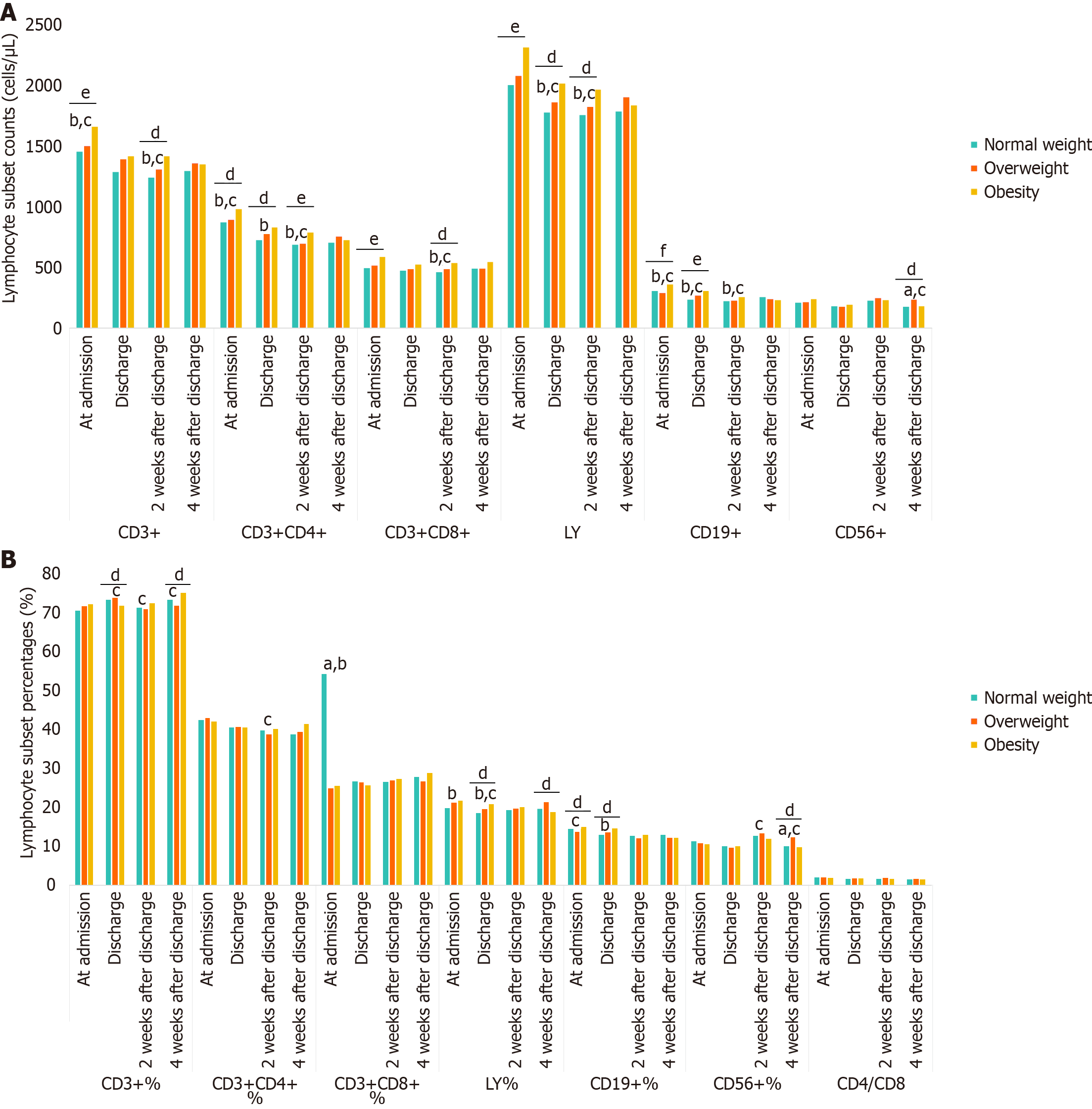 A: Lymphocyte subset counts (cells/μL); B: Lymphocyte subset percentages (%). aP < 0.05, normal weight vs overweight; bP < 0.05, normal weight vs obesity; cP < 0.05, overweight vs obesity; dP < 0.05; eP < 0.01; fP < 0.001. Normal weight: 18.5 ≤ body mass index (BMI) < 24; Overweight: 24 ≤ BMI < 28; Obesity: BMI ≥ 28; LY: Lymphocyte counts.