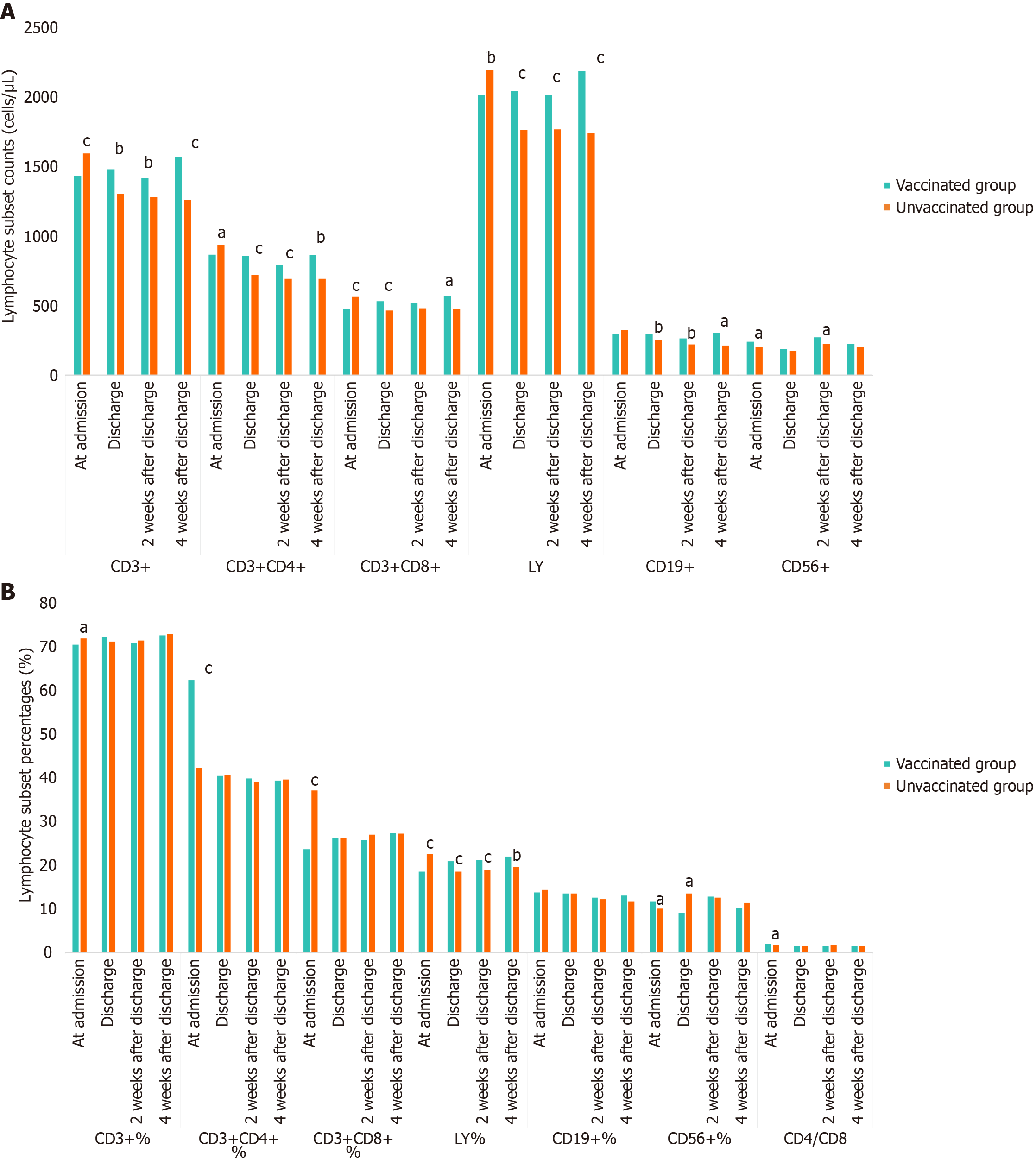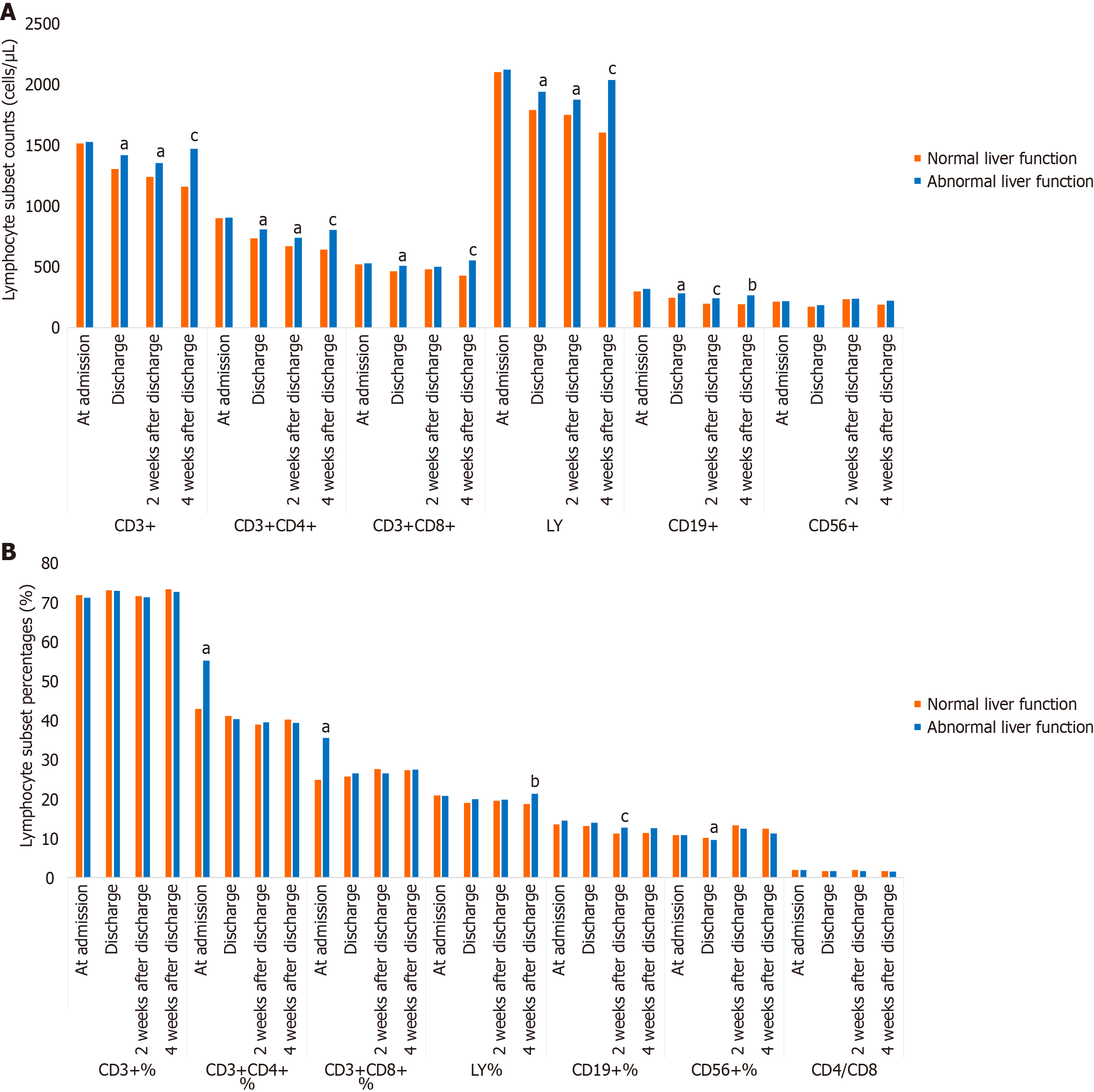 A: Lymphocyte subset counts (cells/μL); B: Lymphocyte subset percentages (%). aP < 0.05; bP < 0.01; cP < 0.001. LY: Lymphocyte counts.