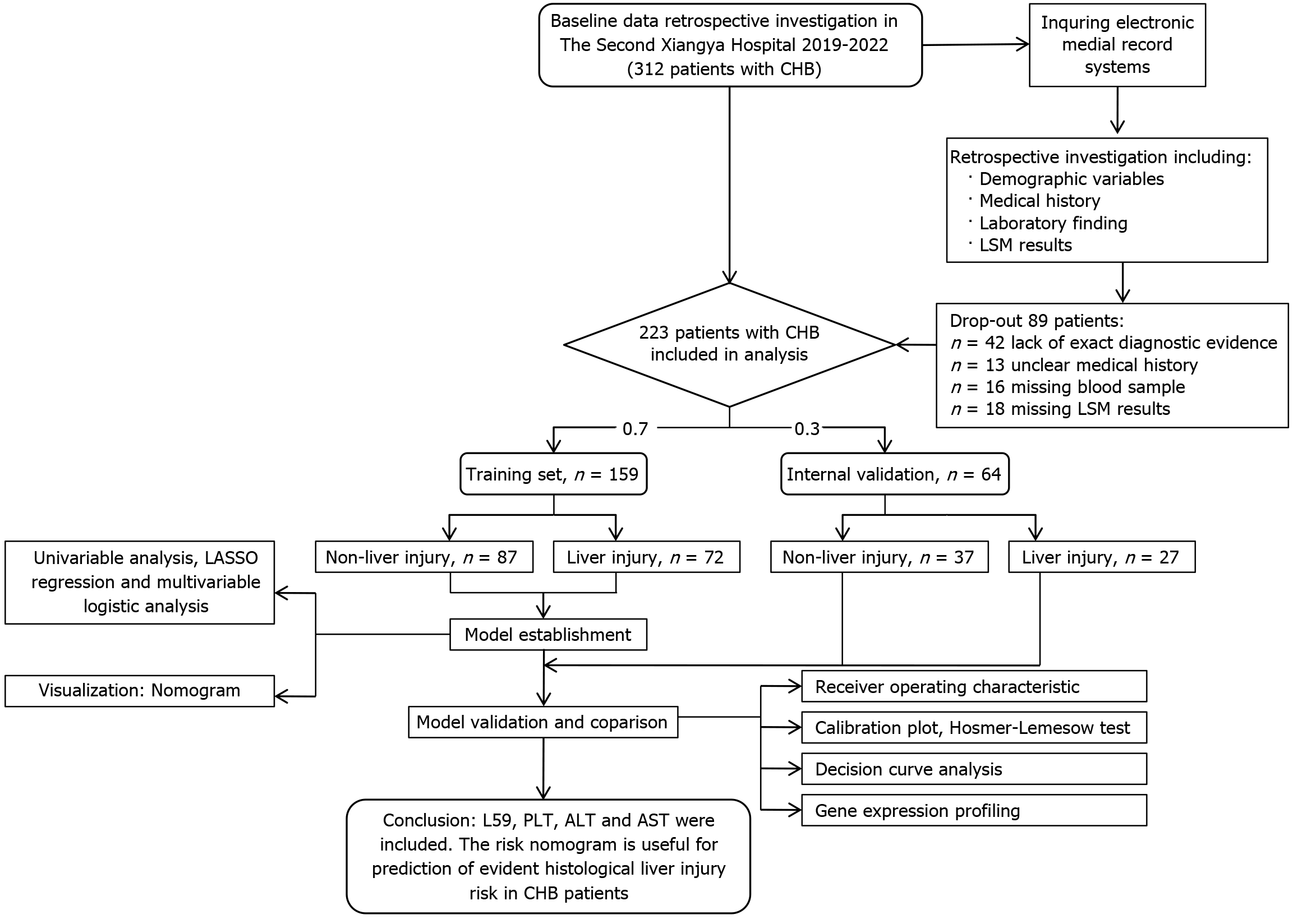 CHB: Chronic hepatitis B; LSM: Liver stiffness measurement; LASSO: Least absolute shrinkage and selection operator; PLT: Platelet; ALT: Alanine transaminase; AST: Aspartate transaminase.