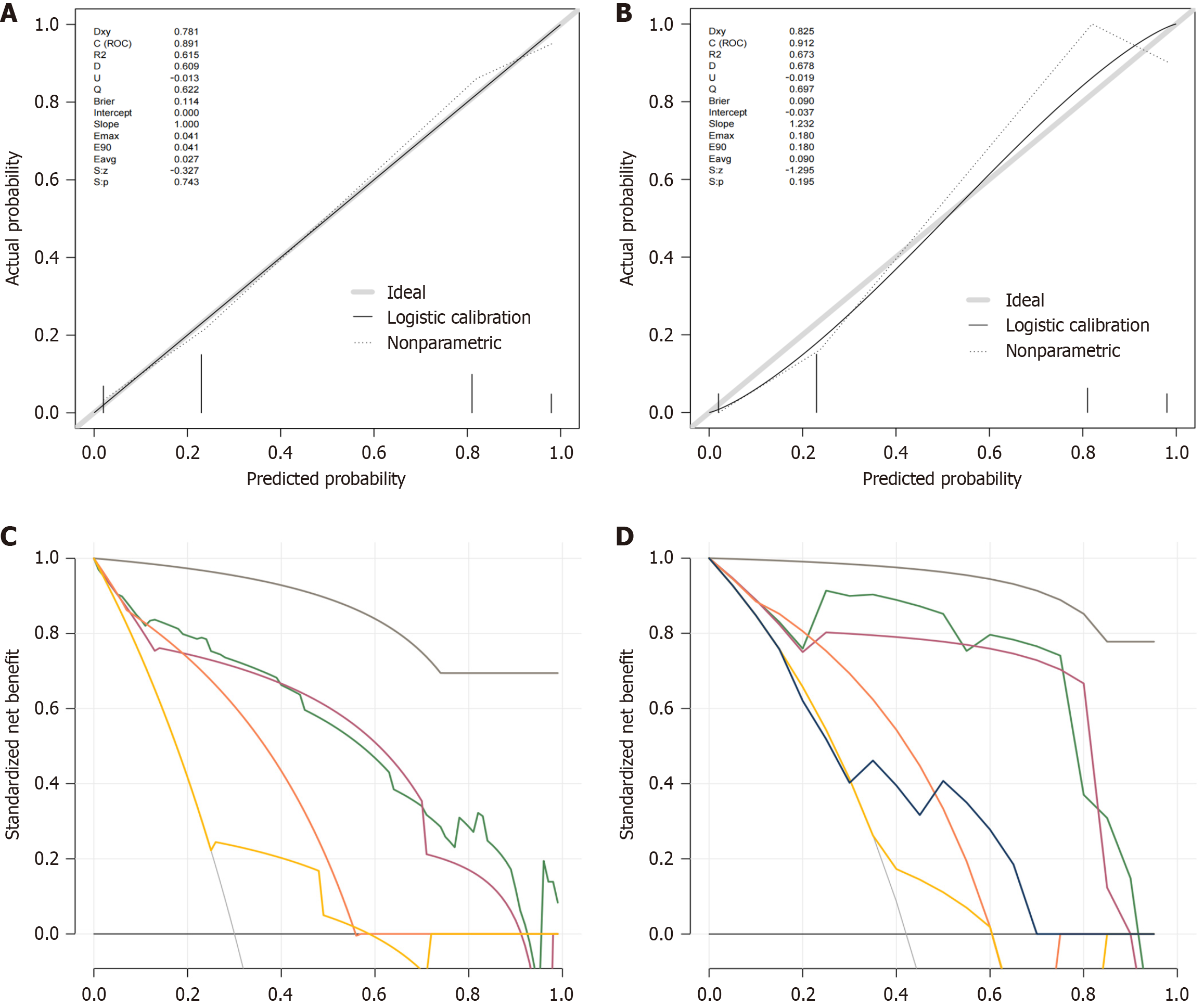 A and B: Calibration plots of the multivariable logistic regression model for evident histological liver injury risk prediction in the training and validation group with chronic hepatitis B (CHB) infection; C and D: Decision curve analysis of the multivariable logistic regression model for evident histological liver injury risk prediction in the training and validation group with CHB infection.