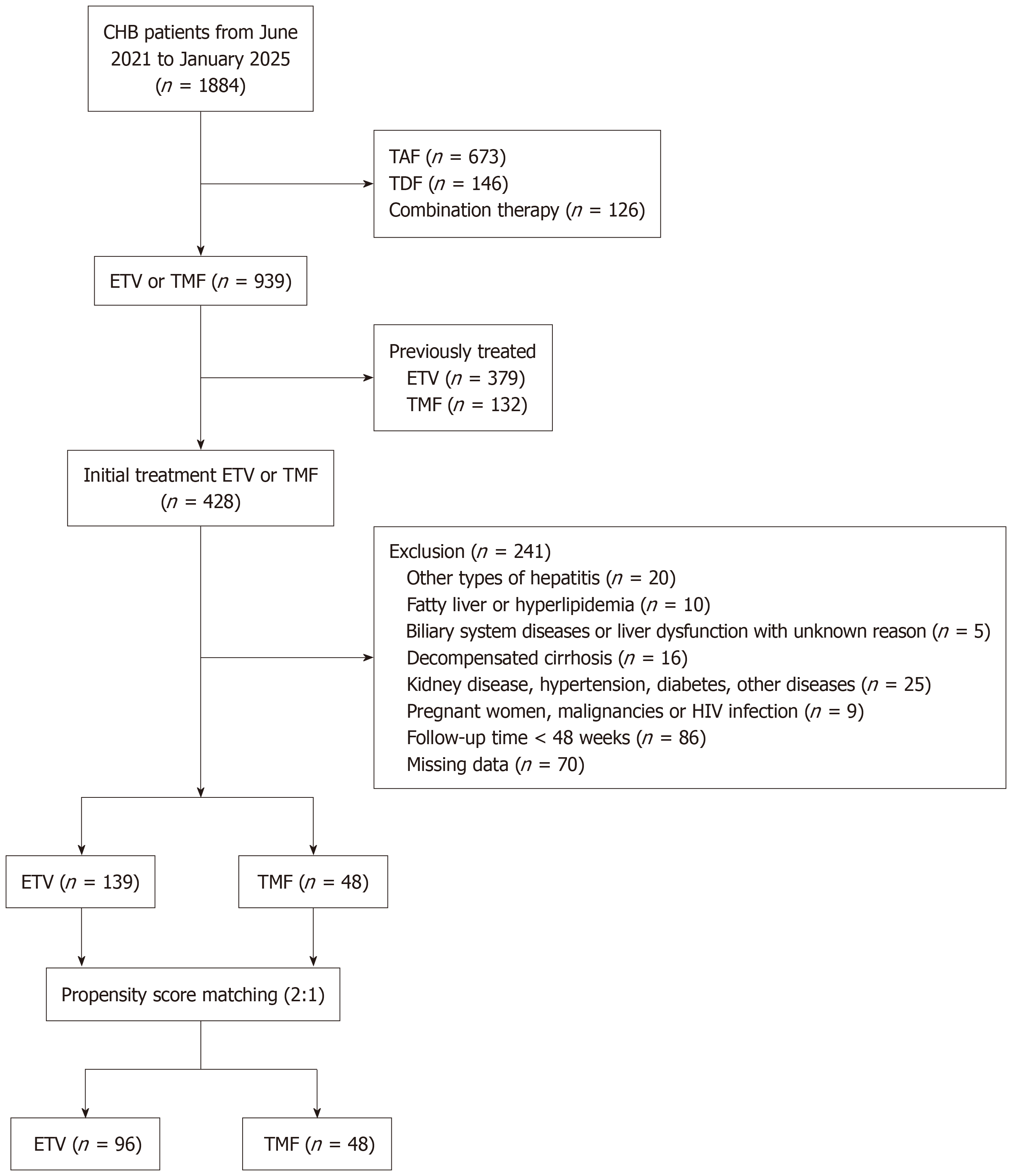 CHB: Chronic hepatitis B; ETV: Entecavir; TMF: Tenofovir amibufenamide; TAF: Tenofovir alafenamide; TDF: Tenofovir disoproxil fumarate; HIV: Human immunodeficiency virus.
