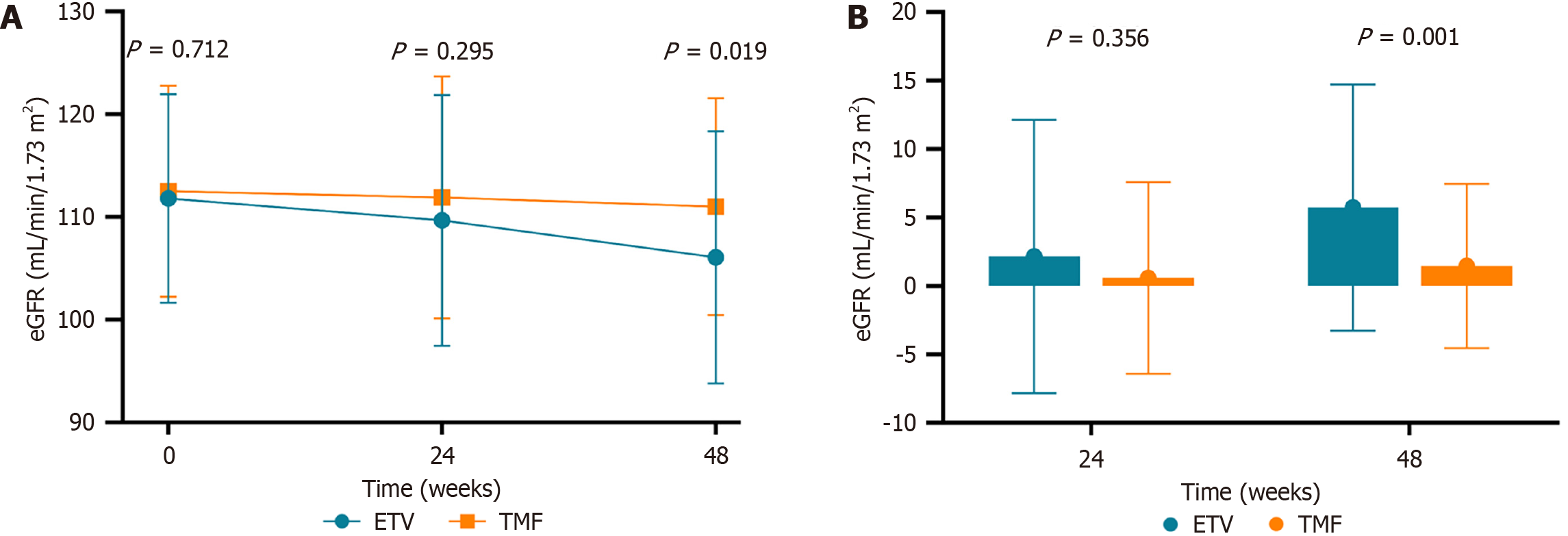 A: Dynamic changes over time; B: Extent of decline. eGFR: Estimated glomerular filtration rate; ETV: Entecavir; TMF: Tenofovir amibufenamide.