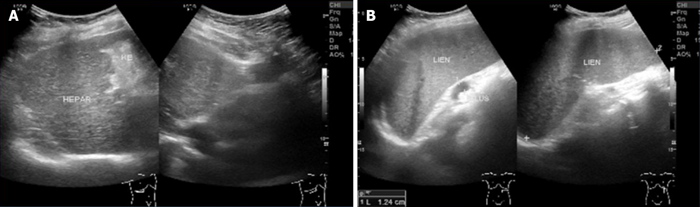 A: Right lobe liver (hepar), showing coarse hepatic echotexture consistent with chronic liver disease; B: Spleen (lien) showing splenomegaly with measurement 12.4 cm.