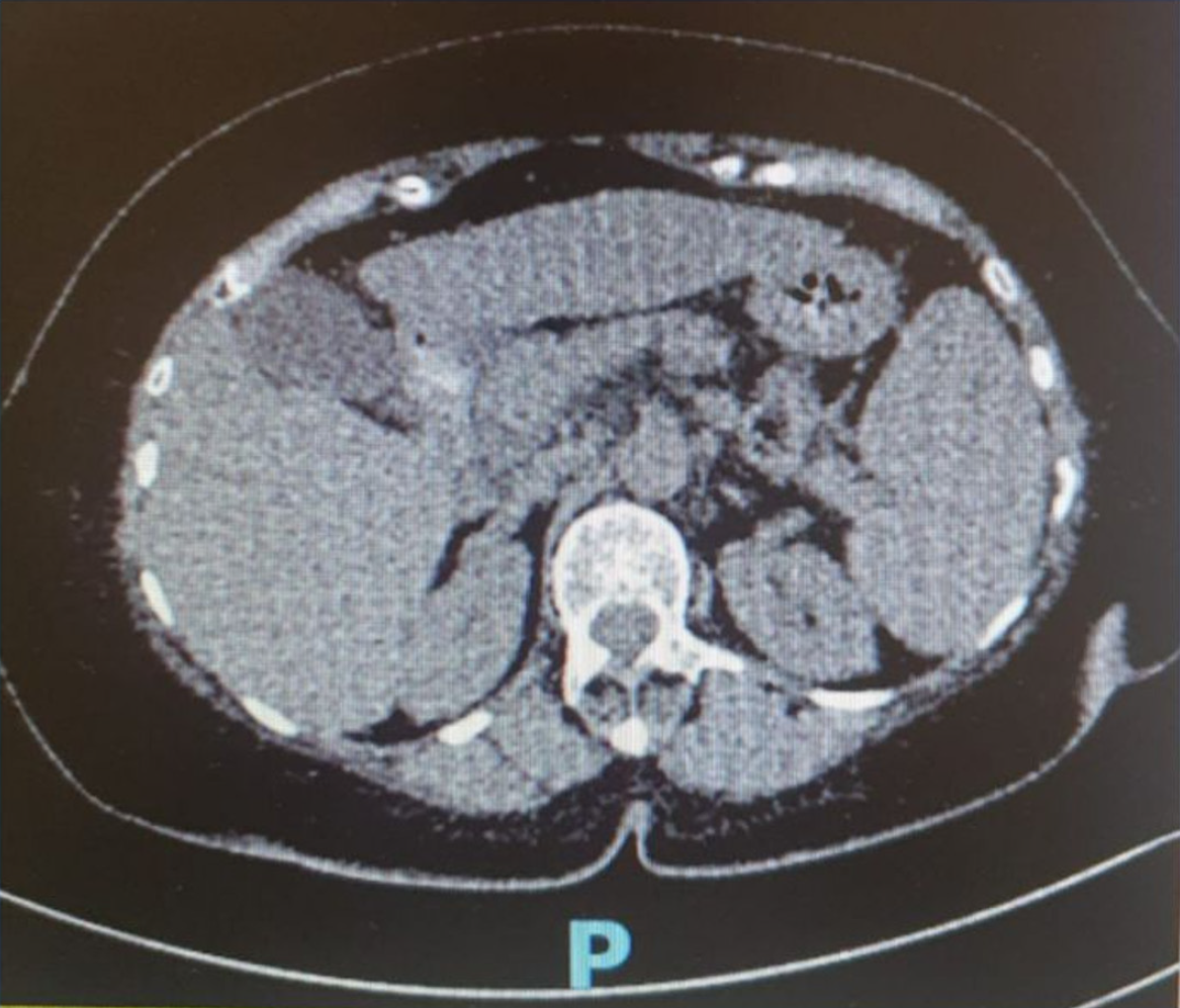 Figure 2 Abdominal computed tomography scan demonstrating moderate diffuse hepatic steatosis, splenic vein dilation, splenomegaly and multiple gallstones with mild cholecystitis.