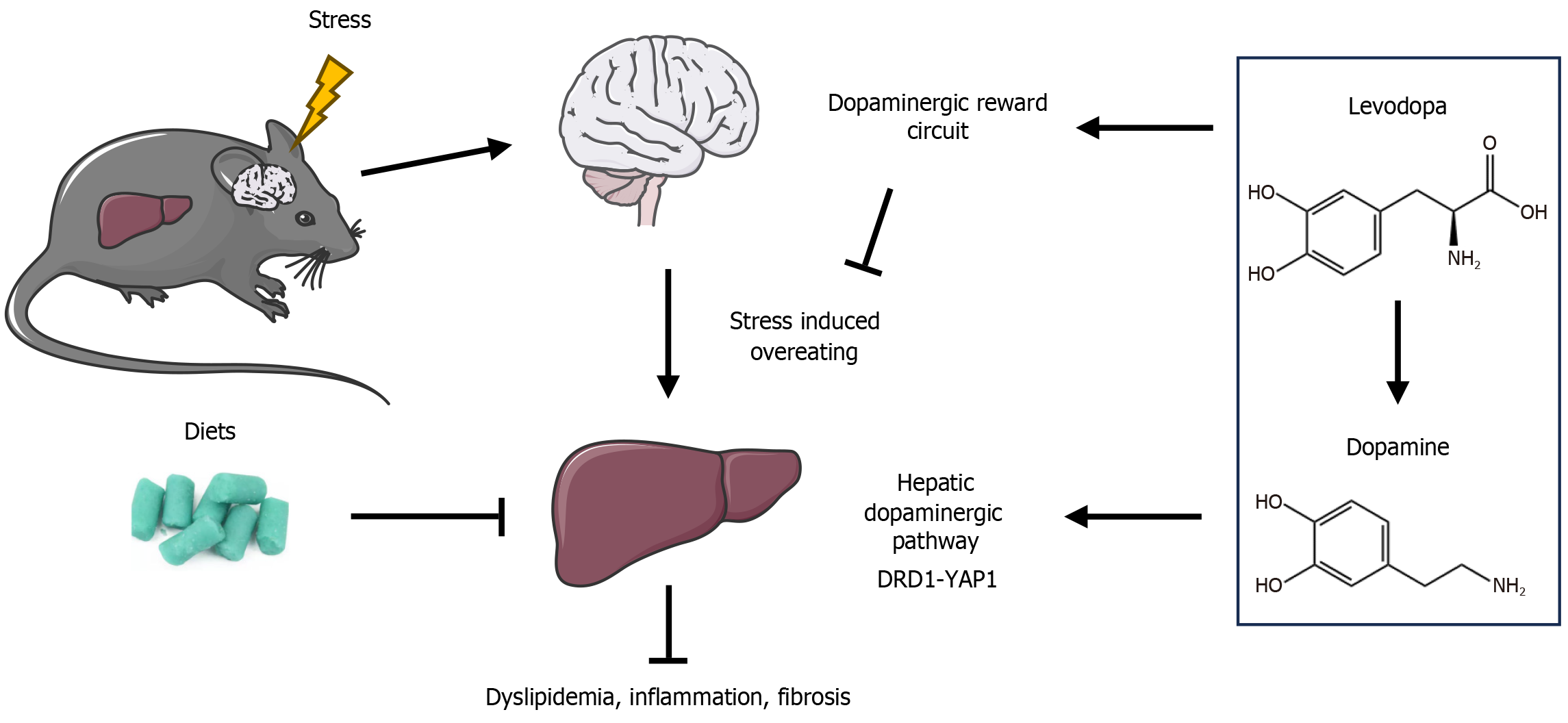 Figure 1 The schematic illustration of the putative mechanisms underlying levodopa-mediated therapeutic effects in liver disease.