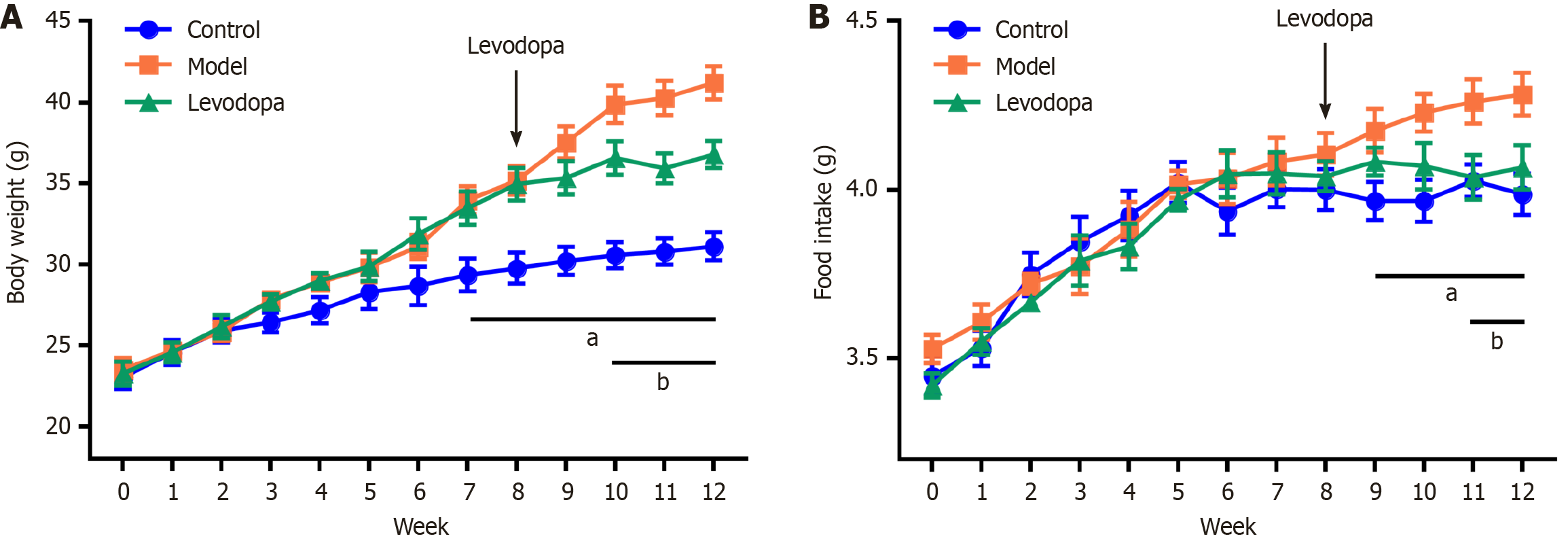 A: The body weight was recorded weekly; B: The food consumption was recorded weekly. Male C57BL/6 mice aged 6-8 weeks were used in this study (n = 6). A murine model was constructed by a chronic restraint stress experiment combined with high fat, high fructose, and high cholesterol diets, while the levodopa (10 mg/kg) was intraperitoneally injected as intervention from the eighth week. This experiment was conducted under the supervision of the Institutional Animal Ethics Committee of the Shanghai Hospital of Traditional Chinese Medicine. Repeated-measures analysis of variance was employed for the statistical analysis of body weight and food intake. aP < 0.05, compared between the control group and the model group; bP < 0.05, compared between the model group and the levodopa group.