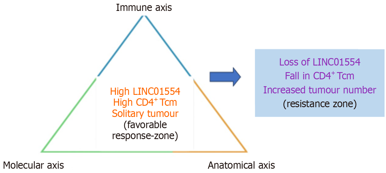 This schematic illustrates how molecular (LINC01554 expression), immune (CD4+ central memory T cell infiltration), and anatomical (tumour morphology) axes interact to define therapeutic outcomes. Tumours characterised by high LINC01554, high CD4+ memory T-cell, and solitary morphology cluster within a favourable response zone, whereas loss of these features such as reduced LINC01554 expression, declining CD4+ memory T-cell, or increased tumour number progressively shifts the disease toward a resistance zone, reflecting transition from biological sensitivity to refractoriness.