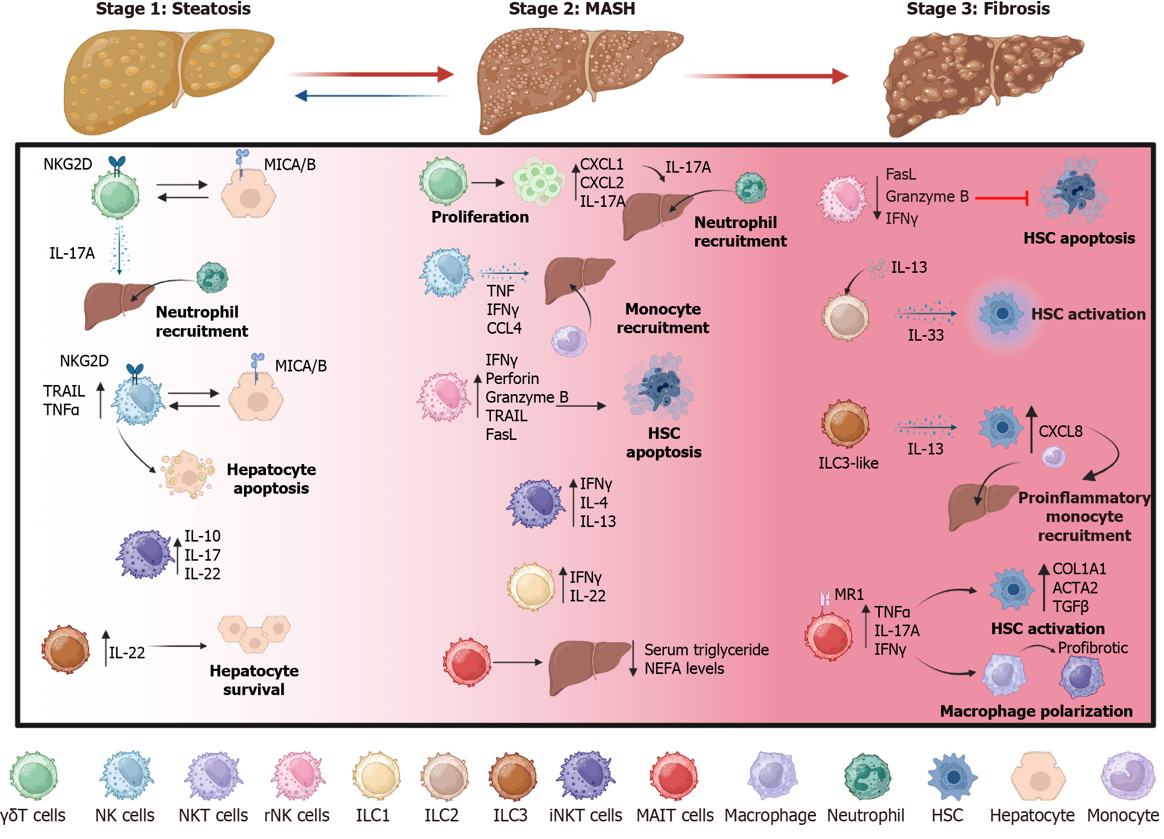 During early metabolic dysfunction-associated steatotic liver disease, metabolic stress and lipid accumulation injure hepatocytes and upregulate stress ligands (major histocompatibility complex class I chain-related proteins A/B) and damage-associated molecular patterns, which activate gamma delta T (γδT) cells and natural killer (NK) cells through NK group 2 member D. γδT cells and innate lymphoid cell (ILC)-3 release interleukin (IL)-17A, licensing liver cells to produce C-X-C motif ligand 1 (CXCL1) and CXCL2 that recruit neutrophils and C-C motif chemokine ligand 2 that recruit monocytes. NK and γδT cells promote hepatocyte apoptosis via tumor necrosis factor alpha (TNF-α)-related apoptosis-inducing ligand, Fas ligand, and TNF-α, whereas IL-22 supports hepatocyte survival. In metabolic dysfunction-associated steatohepatitis, sustained inflammation is dominated by interferon-gamma, IL-13, and IL-17A drives monocyte recruitment and hepatic stellate cell (HSC) activation. The IL-33-ILC2-IL-13 pathway, IL-13-producing ILC3-like cells that induce CXCL8, mucosal-associated invariant T cell outputs via major histocompatibility complex-related molecule 1 (TNF-α, IL-17A, interferon-gamma), and invariant NKT cell cytokines further amplify HSC activation. Persistent immune activation polarizes macrophages toward pro-fibrotic phenotypes and increases HSC expression of collagen type I α1 chain, α-smooth muscle actin, and transforming growth factor beta. The schematic integrates crosstalk between lymphocyte subsets (γδT, NK, resident NK, invariant NKT, mucosal-associated invariant T, and ILCs) and hepatic cells (hepatocytes, macrophages, and HSCs) across metabolic dysfunction-associated steatotic liver disease stages. MASH: Metabolic dysfunction-associated steatohepatitis; NKG2D: Natural killer group 2 member D; MICA/B: Major histocompatibility complex class I chain-related proteins A/B; IL: Interleukin; TRAIL: Tumor necrosis factor alpha-related apoptosis-inducing ligand; TNF: Tumor necrosis factor; CXCL: C-X-C motif ligand; IFNγ: Interferon gamma; CCL: C-C motif chemokine ligand; HSC: Hepatic stellate cell; NEFA: Non-esterified fatty acids; FasL: Fas ligand; MR1: Major histocompatibility complex-related molecule 1; COL1A1: Collagen type I α1 chain; ACTA2: Α-smooth muscle actin; TGFβ: Transforming growth factor beta; γδT: Gamma delta T; NKT: Natural killer T cell; rNK: Resident natural killer.