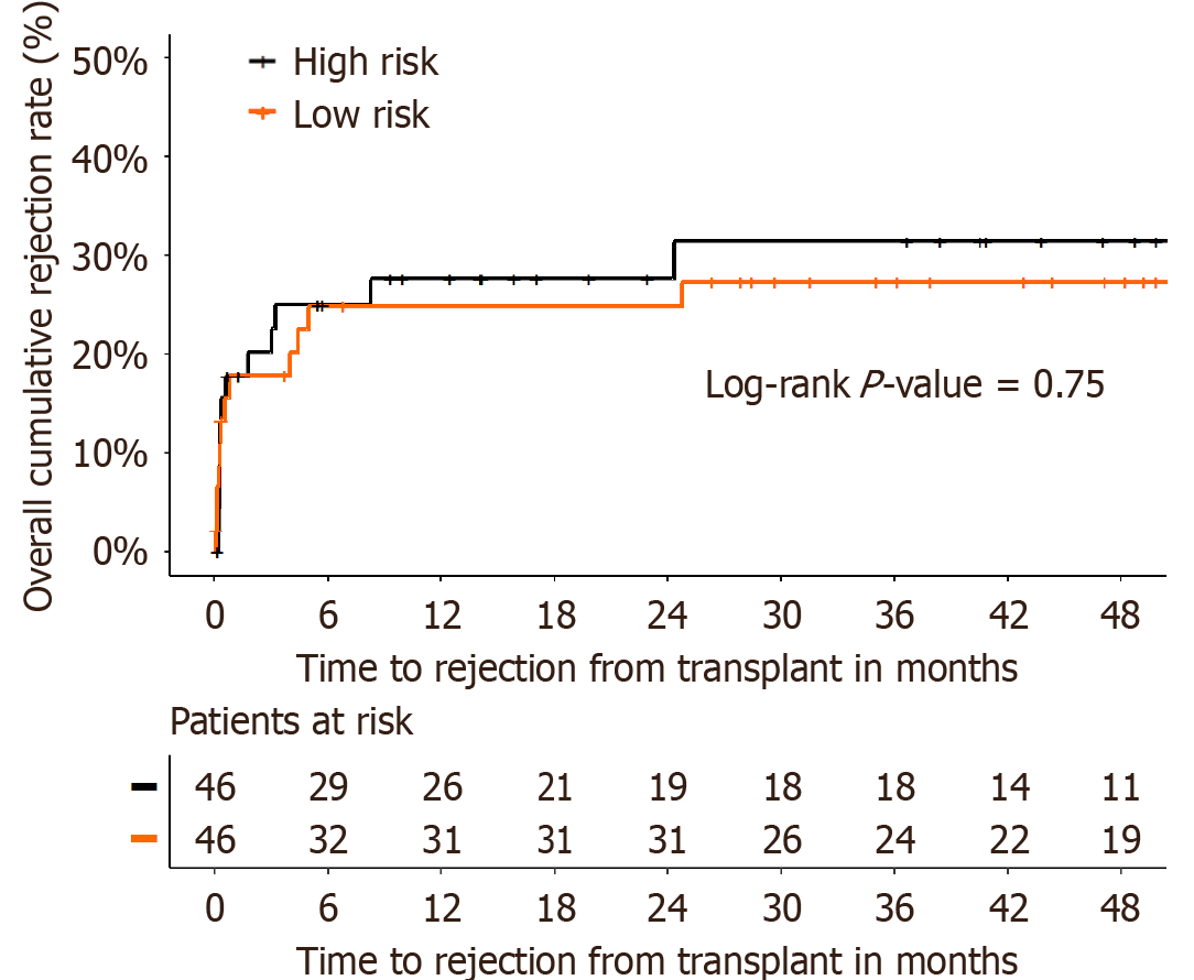 Kaplan-Meier analysis of cumulative time to biopsy-proven acute rejection after liver transplantation during the study period, comparing the high-risk and low-risk groups (log rank P = 0.75).