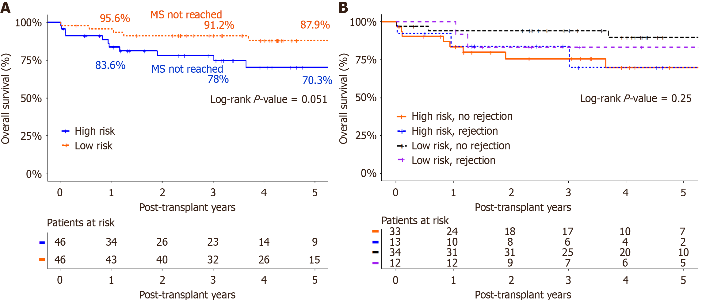 A: Patient survival after liver transplantation according to immunological status. Kaplan-Meier analysis of patient survival after liver transplantation during the study period, comparing the high-risk and low-risk groups (log rank P = 0.051); B: Patient survival after liver transplantation in both groups according to the occurrence of rejection. Kaplan-Meier analysis of patient survival after liver transplantation showing comparison between the high-risk with rejection, high-risk without rejection, low-risk with rejection and low-risk without rejection groups (log rank P = 0.25). MS: Median survival.