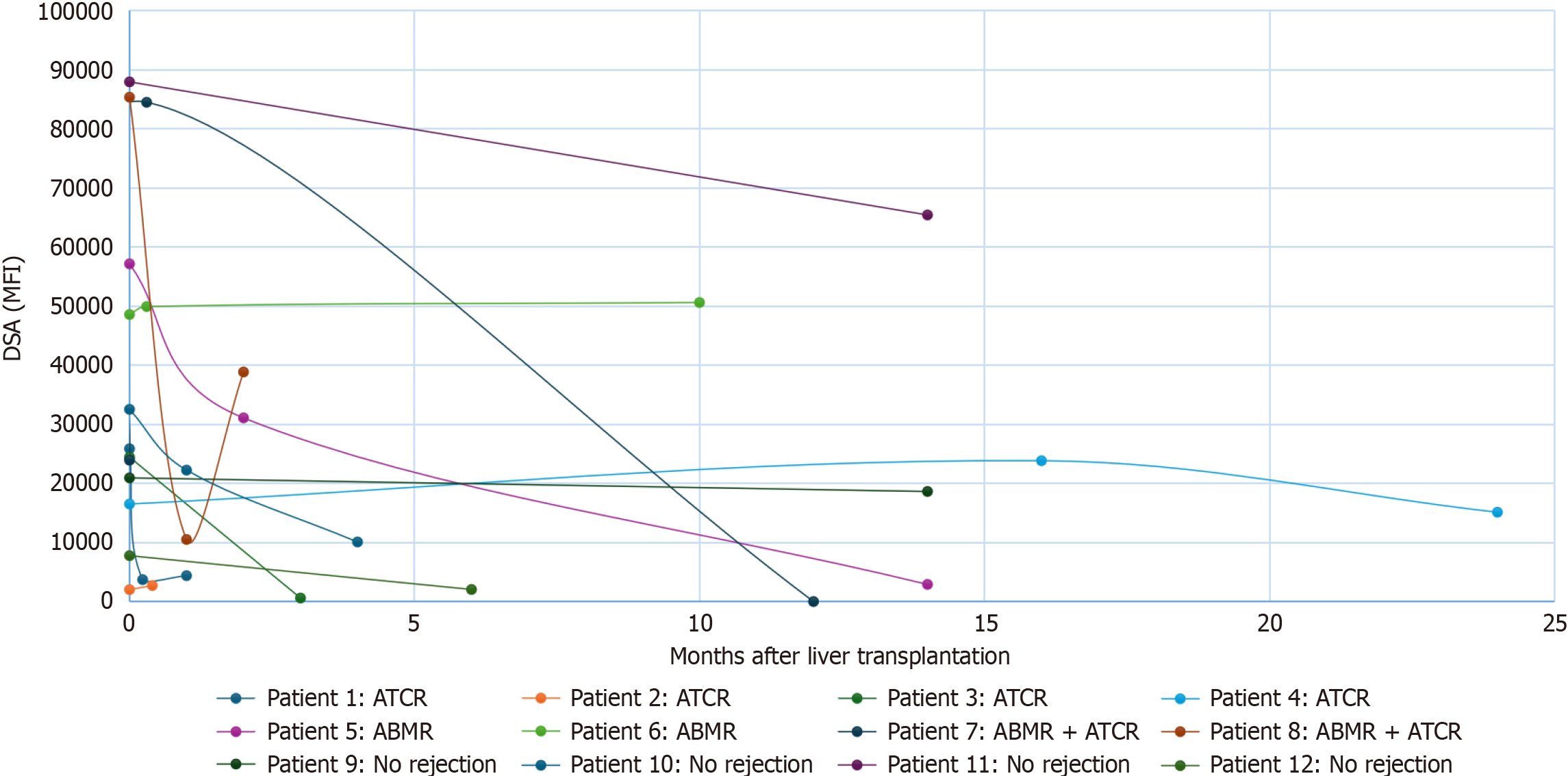 Figure 4 Donor-specific antibodies monitoring following liver transplantation in 12 patients (4 patients with acute antibody-mediated rejection, 4 with T-cell mediated rejection and 4 without rejection).