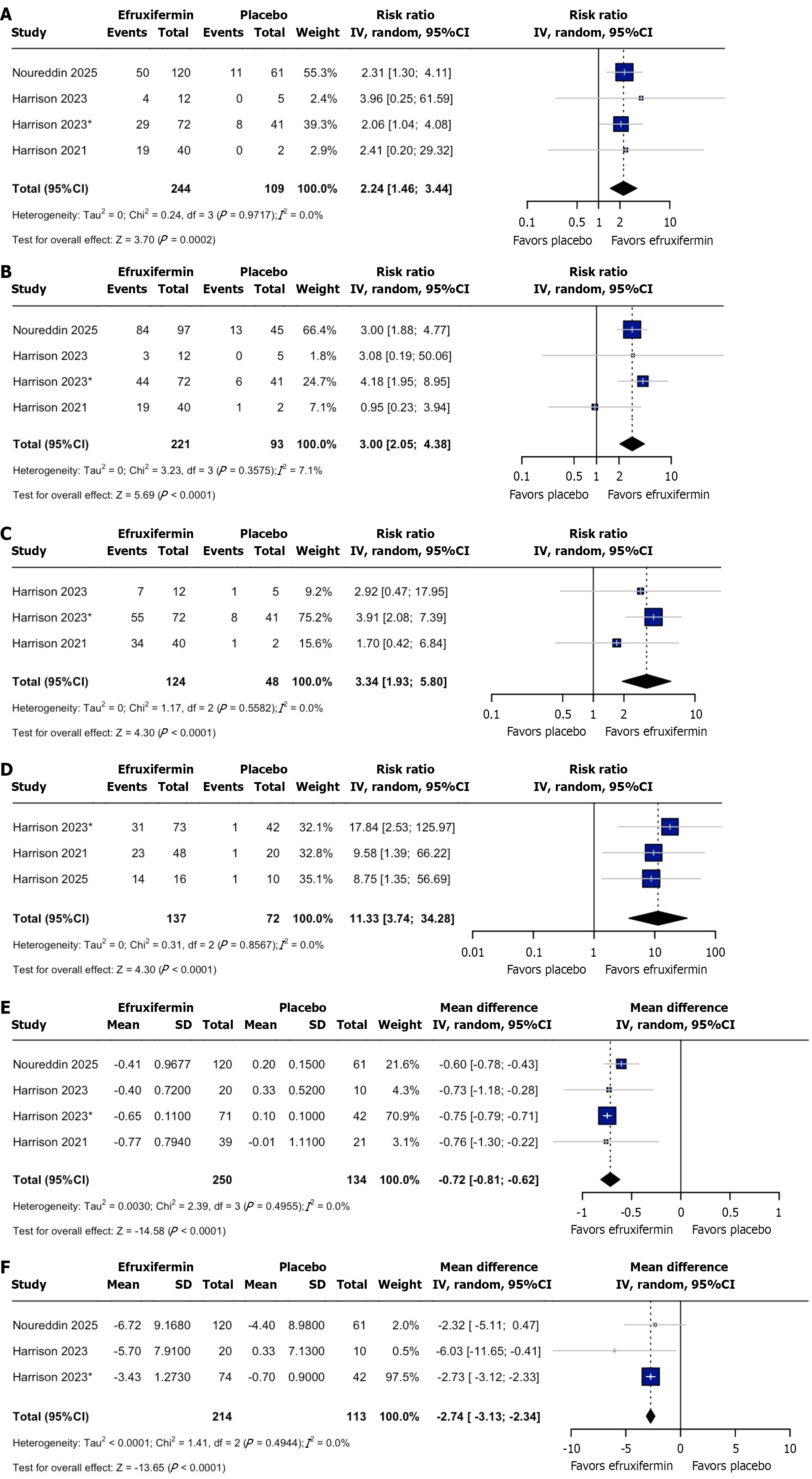A: Achieving at least one stage of improvement in fibrosis without worsening of metabolic-associated steatohepatitis; B: Metabolic-associated steatohepatitis resolution without worsening fibrosis; C: At least a two-point improvement in the non-alcoholic fatty liver disease activity score with no worsening of fibrosis; D: Normalized liver fat; E: Enhanced liver fibrosis test score; F: Liver stiffness measurement score. CI: Confidence interval.