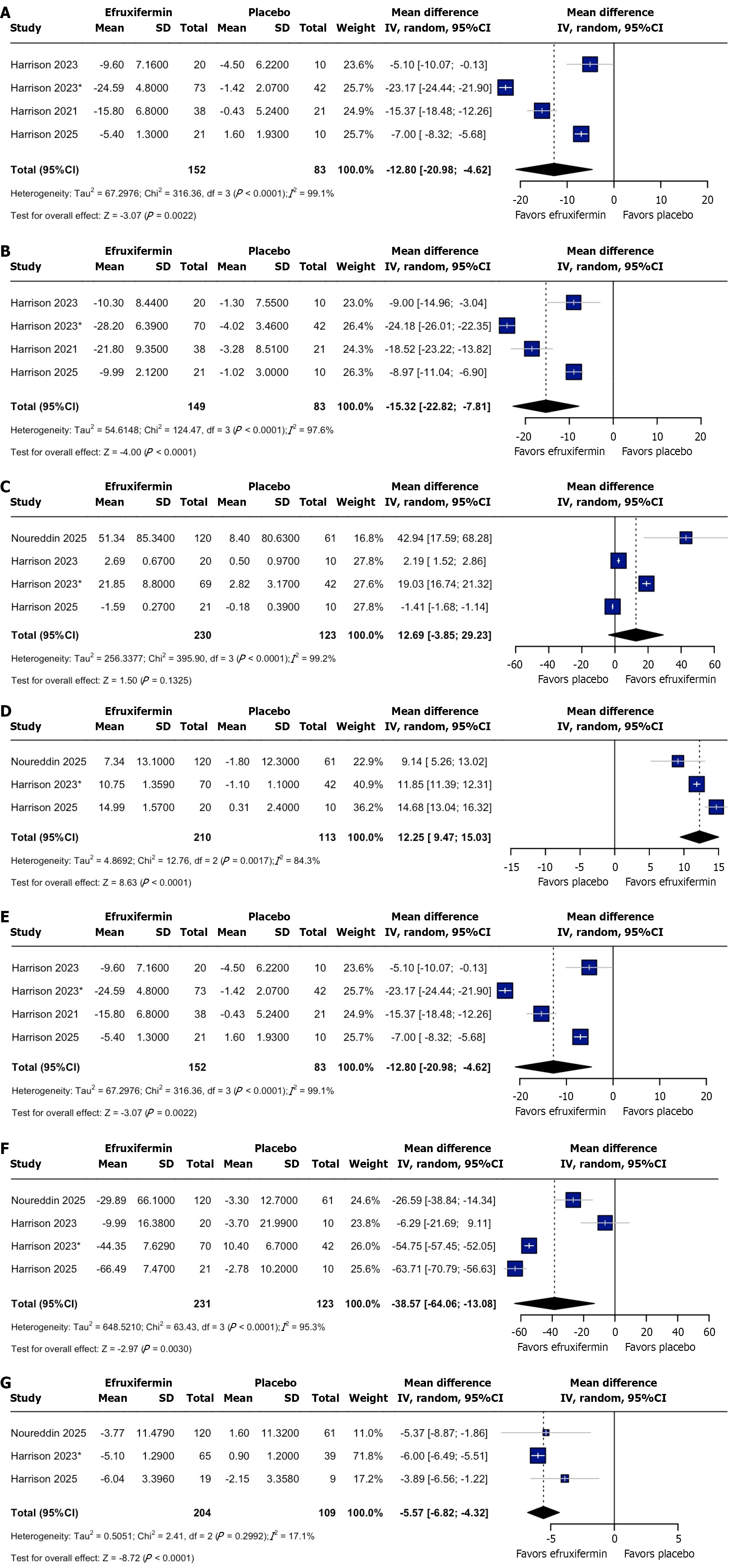 A: Change in alanine aminotransferase; B: Change in aspartate aminotransferase; C: Percentage change in adiponectin; D: High-density lipoprotein cholesterol; E: Low-density lipoprotein cholesterol; F: Triglycerides; G: Homeostatic model assessment index. CI: Confidence interval.