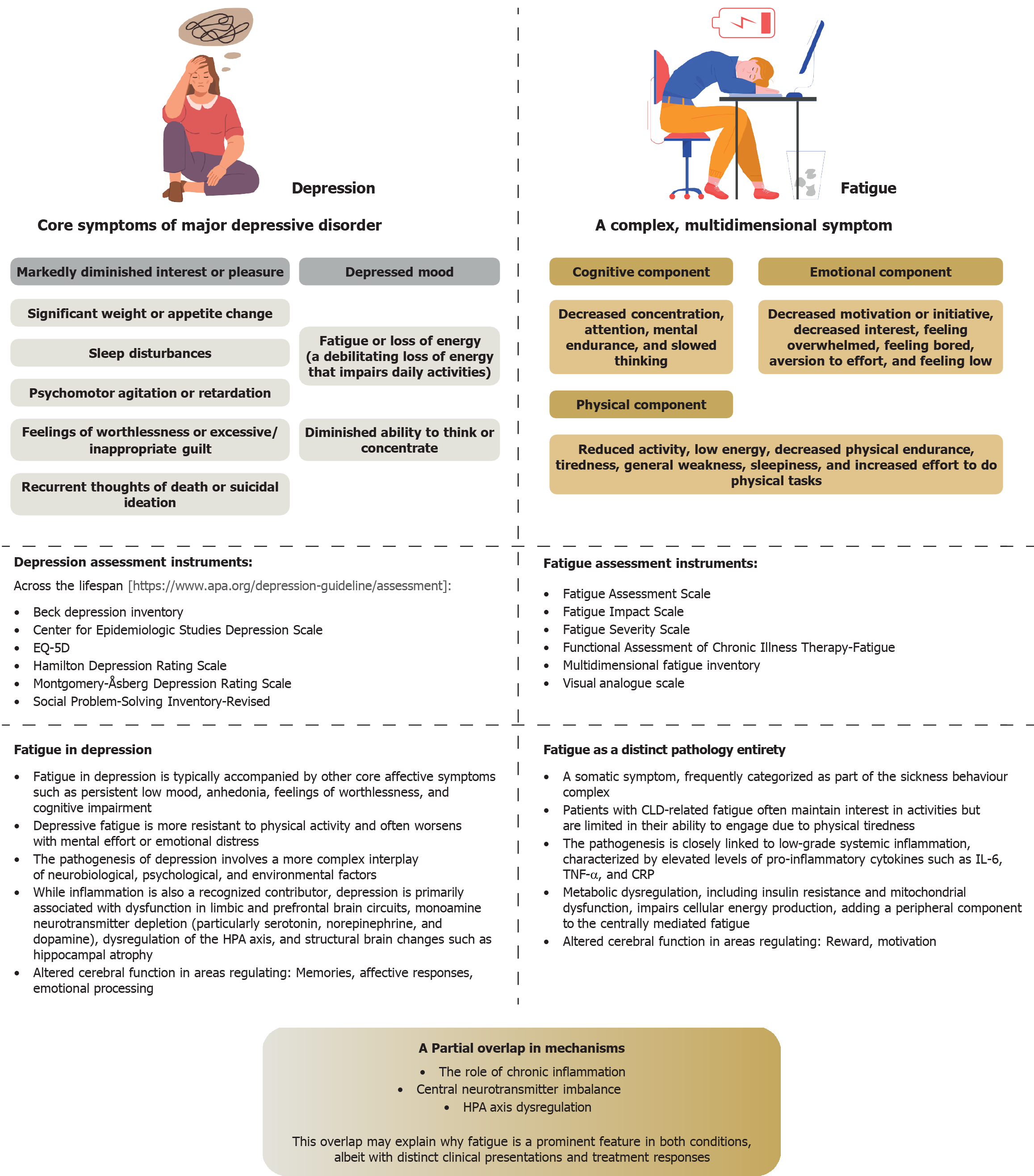 It is crucial to distinguish pathological fatigue from depressive disorders, despite their close association and overlapping pathogenic mechanisms and clinical features, including apathy, reduced physical and mental activity, and disturbances in sleep, concentration, and motivation[23,24]. Fatigue and depression are separate constructs with distinct diagnostic criteria and treatment strategies. Fatigue is a complex, multidimensional symptom encompassing: (1) Physical manifestations, such as reduced activity, low energy, diminished physical endurance, tiredness, generalized weakness, sleepiness, and increased exertion required for physical tasks; (2) Cognitive impairments, including reduced concentration, attentional deficits, decreased mental stamina, and slowed processing speed; and (3) Emotional aspects, such as diminished motivation or initiative, loss of interest, feelings of being overwhelmed, boredom, effort aversion, and a sense of lowness[25]. In CLD, fatigue predominantly manifests as physical symptoms, with patients frequently reporting persistent energy depletion or exhaustion unalleviated by rest. Unlike depressive disorders, CLD-related fatigue typically lacks core affective or cognitive symptoms, such as persistent sadness, excessive guilt or feelings of worthlessness, hopelessness, or suicidal ideation. Furthermore, while patients with CLD-related fatigue may retain interest in activities, their engagement is limited by physical exhaustion. In contrast, depression is characterized by more pervasive anhedonia, defined as a pronounced loss of interest or pleasure.
