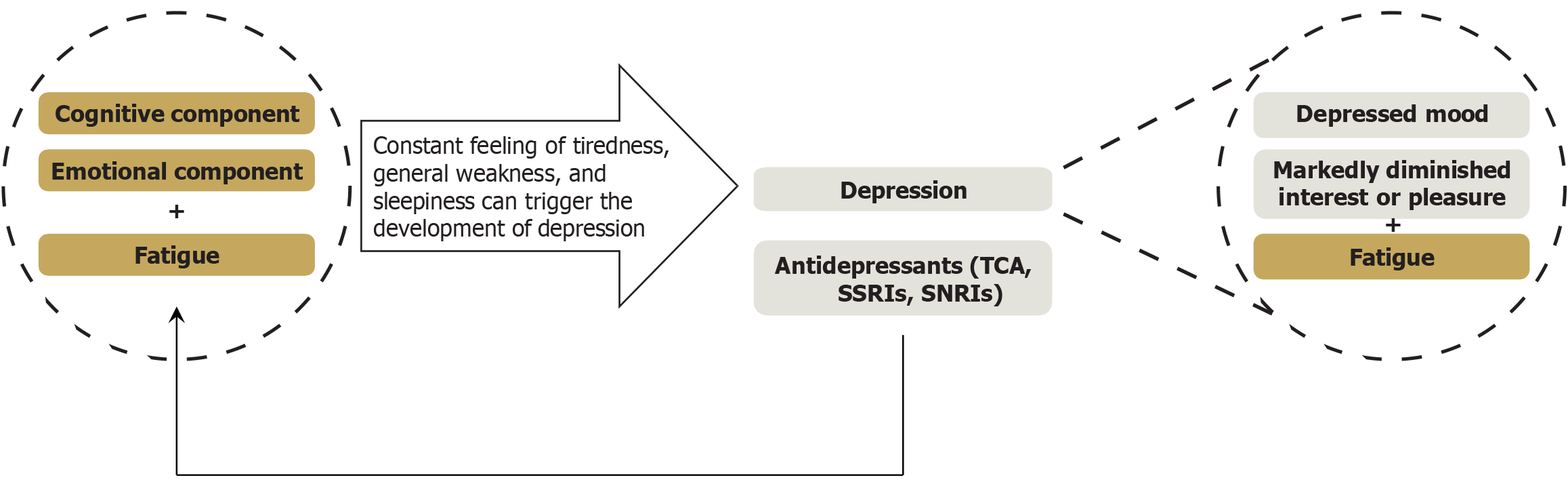 In the context of chronic liver disease, fatigue and depression are generally regarded as distinct pathological entities. However, the persistent feelings of tiredness, general weakness, and sleepiness characteristic of fatigue can precipitate the development of depression. In such cases, a patient experiencing fatigue should also exhibit either a depressed mood or markedly diminished interest or pleasure in most activities for a minimum duration of two weeks. Conversely, certain medications, such as tricyclic antidepressants, selective serotonin reuptake inhibitors, and serotonin-norepinephrine reuptake inhibitors, can independently induce fatigue. Therefore, in patients with metabolic dysfunction-associated steatotic liver disease and depression, fatigue may be caused or exacerbated by these treatments. Under these circumstances, fatigue often manifests as a complex, multidimensional condition involving not only physical but also cognitive and emotional components. TCAs: Tricyclic antidepressants; SSRIs: Selective serotonin reuptake inhibitors; SNRIs: Serotonin-norepinephrine reuptake inhibitors.