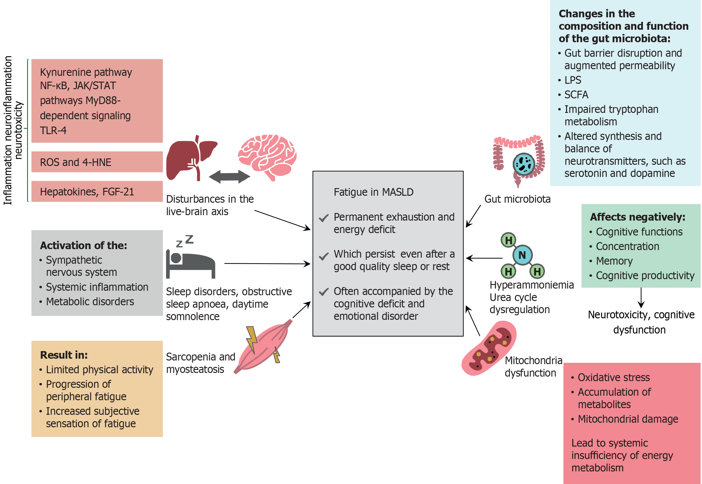 The pathogenesis of fatigue in metabolic dysfunction-associated steatotic liver disease is complex and may involve the following factors: (1) Dysfunction of the liver-brain axis and neuroinflammation; (2) Sleep disorders, particularly obstructive sleep apnea and daytime somnolence; (3) Skeletal muscle disorders, such as sarcopenia and myosteatosis; and (4) Hyperammonemia and urea cycle dysregulation, which may be at least partially attributed to mitochondrial dysfunction and disturbances in gut microbiota composition and function. These mechanisms contribute to systemic and neuroinflammation, alter neurotransmitter synthesis and balance, induce neurotoxicity, and impair systemic energy metabolism. All the aforementioned pathological processes may be interrelated, for example, sarcopenia may contribute to or exacerbate hyperammonemia, thus highlighting the multifactorial nature of fatigue in metabolic dysfunction-associated steatotic liver disease. NF-κB: Nuclear factor-κB; JAK/STAT: Janus kinase/signal transducers and activators of transcription; MyD88: Myeloid differentiation primary response protein 88; TLR-4: Toll-like receptor 4; ROS: Reactive oxygen species; 4-HNE: 4-hydroxynonenal; FGF-21: Fibroblast growth factor-21; MASLD: Metabolic dysfunction-associated steatotic liver disease; LPS: Lipopolysaccharide; SCFA: Short-chain fatty acid.