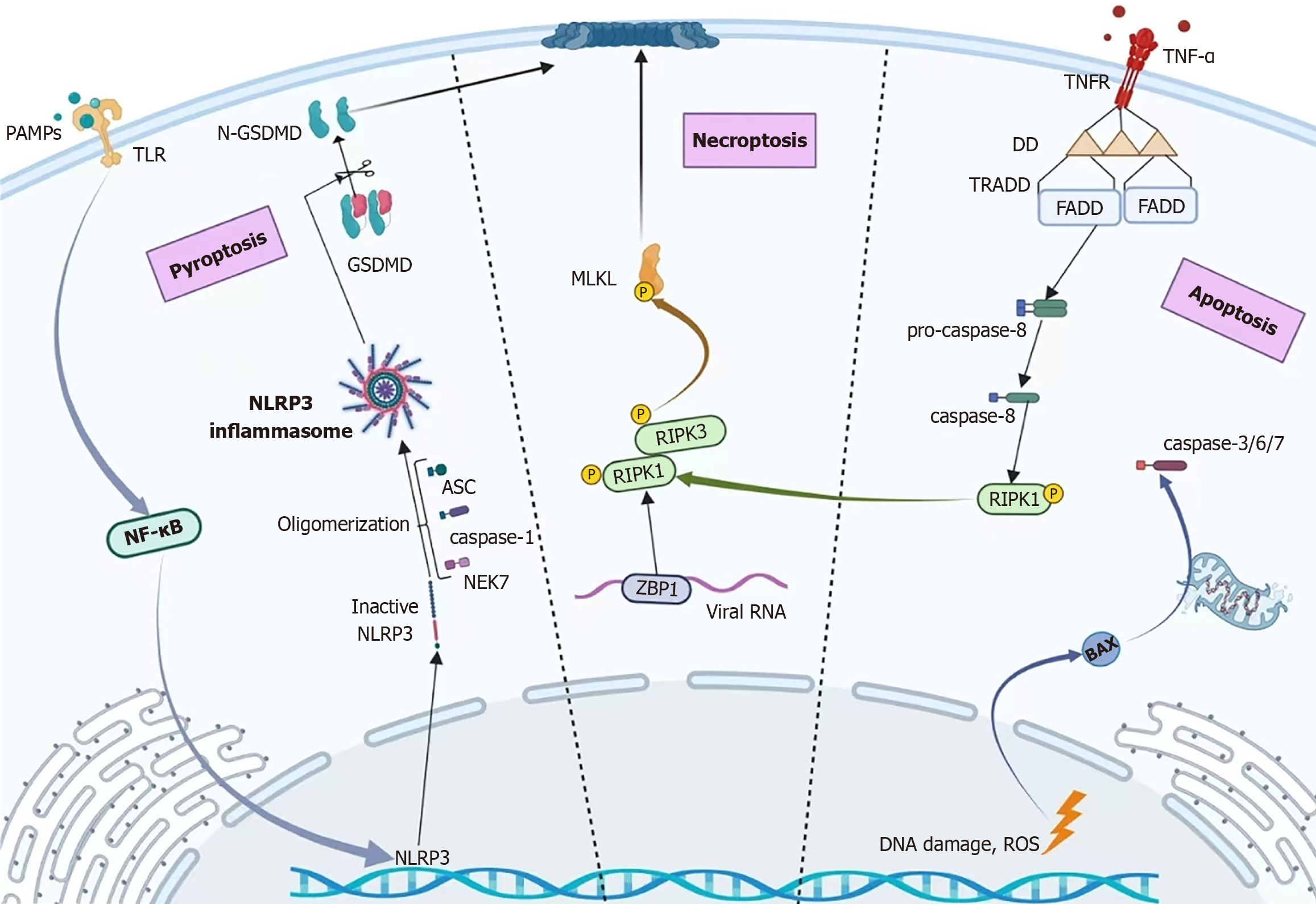 The state of health or disease of a multicellular organism is closely associated with the life and death of individual cells, and the organism needs to remove risk factors through programmed cell death (PCD), as PCD is an active system that helps the organism grow and survive[1]. Pyroptosis, apoptosis and necroptosis are the most prominent forms of PCD that protect the organism from internal and external risk factors[2,3]. In healthy conditions, apoptosis is the primary mechanism of cell death, which is a non-inflammatory, cysteine-dependent process mediated by specific caspases and acts in a cascade fashion[4]. Pyroptosis is a PCD characterized by cell lysis, release of inflammatory components, and caspase-1-dependent plasma membrane pore formation[5]. In contrast, necroptosis is PCD with a necrotic morphology that does not activate caspases but through the receptor interacting serine/threonine kinase 1 and receptor interacting serine/threonine kinase 3 complex signaling pathways[6]. In 2019, Malireddi et al[7] proposed that the concurrent occurrence of pyroptosis, apoptosis, and necroptosis in the same cell population is referred to as PANoptosis. PANoptosis is essentially a dynamically regulated and highly coordinated mechanism of programmed inflammatory cell death. The activation and formation of the PANoptosome is the most vital link in initiating PANoptosis, despite the presence of additional factors, for instance, injury, infection or self-defects. The PANoptosome can activate all three pro-inflammatory cell death processes and contains essential compounds required for pyroptosis, apoptosis, and necroptosis. When an infection or other impediment blocks one or more PCD pathways, PANoptosis provides the host with the means to trigger alternative cell death defense mechanisms[7].
