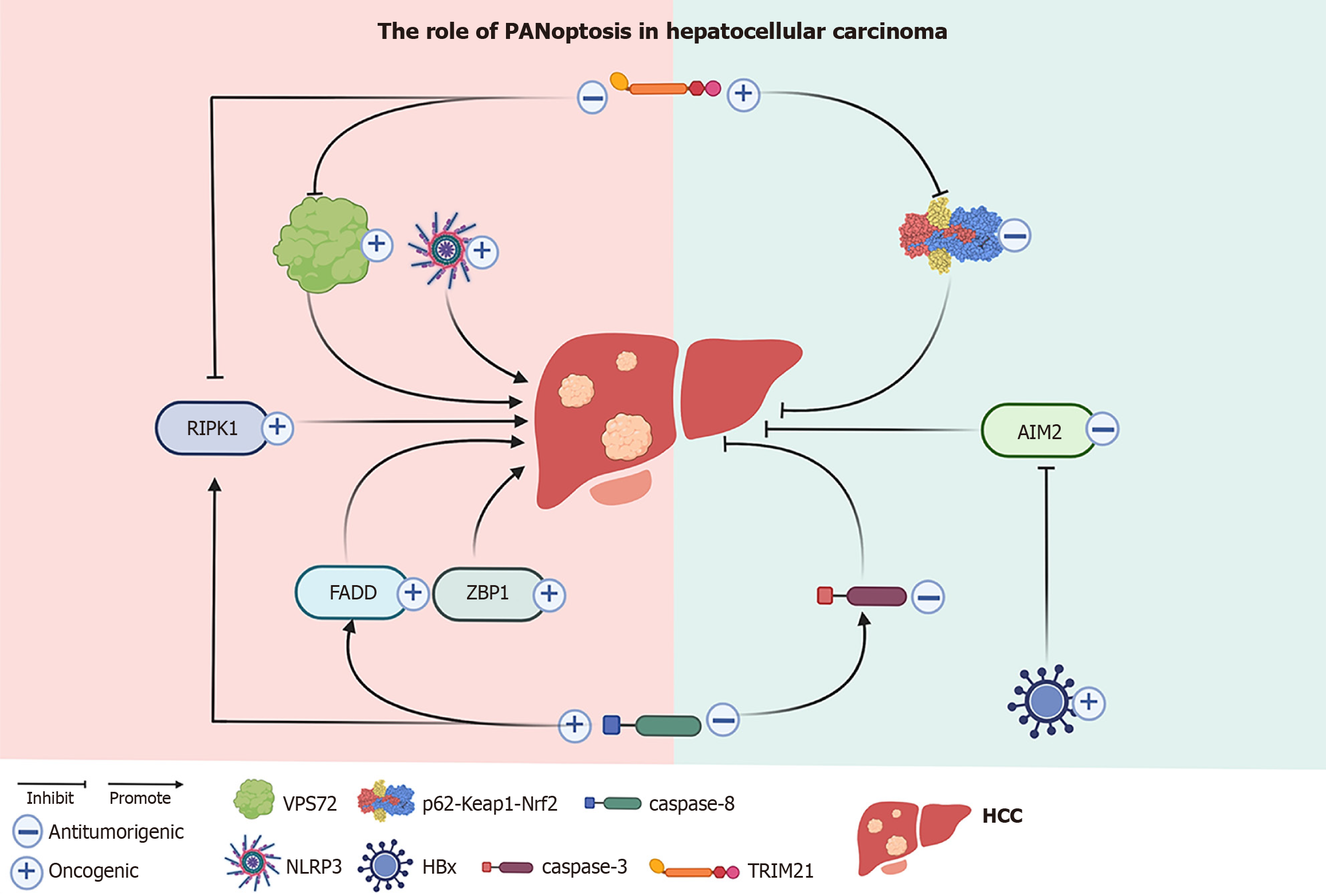 Mechanisms of PANoptosis in hepatocellular carcinoma. Factors that inhibit the hepatocellular carcinoma (HCC) process are covered in green, like hepatitis B virus X (HBx) protein. Factors that can promote the HCC process are covered in red. Triple motif protein 21 (TRIM21) and caspase-8 exhibit both positive and negative regulatory mechanisms in HCC. Through positive regulation, TRIM21 can inhibit tumor suppression by inhibiting the p62 sequestosome 1-kelch-like ECH-associated protein 1-nuclear factor (erythroid-derived 2)-like 2 (p62-Keap1-Nrf2) antioxidant pathway. In contrast, its negative regulation involves two inhibitory pathways, receptor-interacting serine/threonine kinase 1 and vacuolar protein sorting 72 (VPS72), which suppress HCC progression. Caspase-8, while enhancing the tumor-suppressive activity of caspase-3, can also promote HCC development through interactions with Fas-associated protein with death domain (FADD) and receptor-interacting serine/threonine kinase 1 (RIPK1). AIM2: Absent in melanoma 2; NLRP3: NLR family pyrin domain containing 3; ZBP1: Z-DNA binding protein 1.
