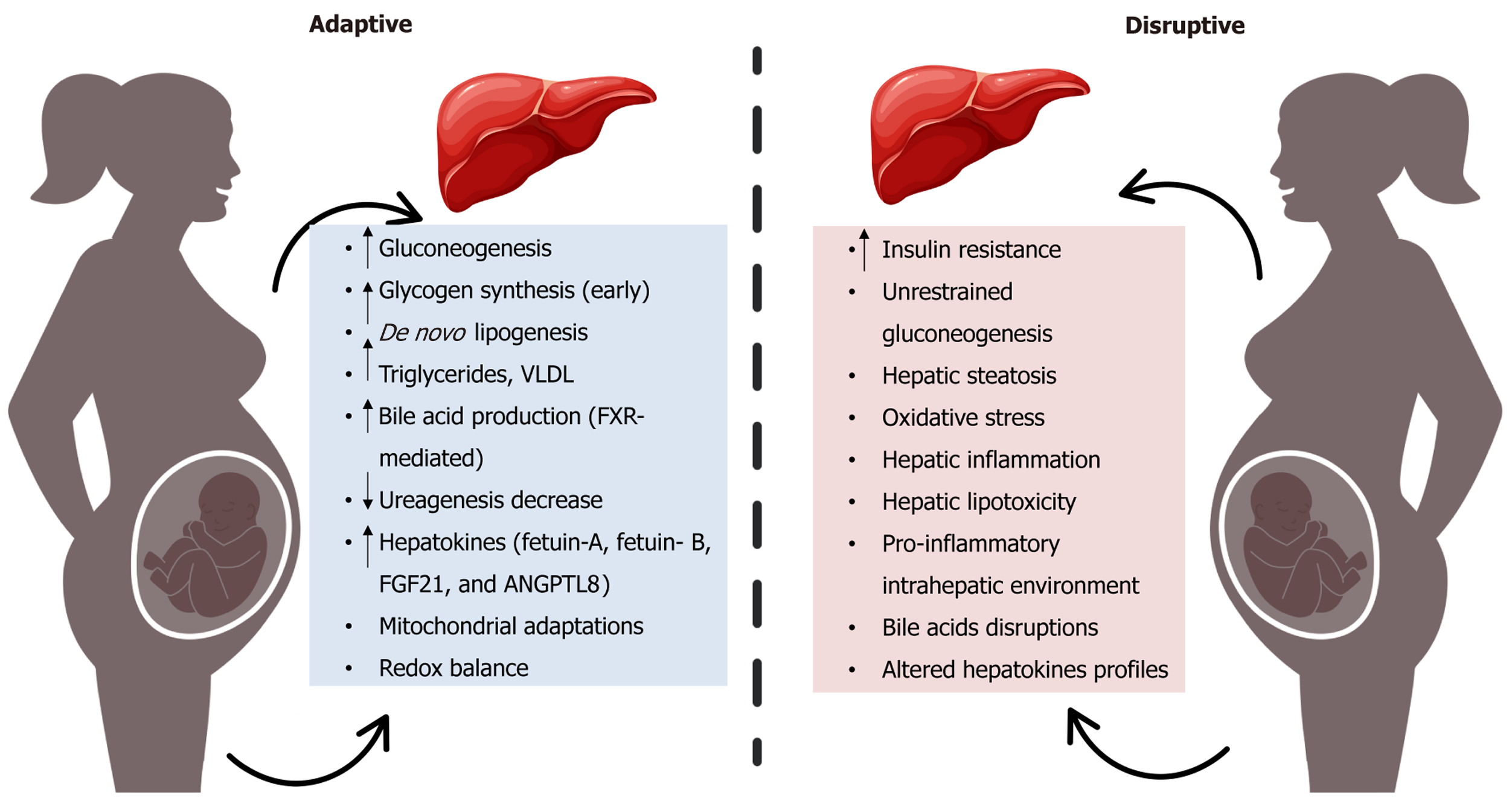 The maternal liver plays a pivotal role in orchestrating the metabolic adaptations required to support a healthy pregnancy. Far from being a passive metabolic depot, the liver actively senses and responds to hormonal, nutritional, and physiological cues. This dynamic regulation ensures a balance between maternal metabolic needs and the increasing demands of the developing fetus. Broadly, the liver’s role evolves over the course of pregnancy from promoting nutrient storage and anabolic processes in early gestation to mobilizing energy substrates during the later stages to support rapid fetal growth[8].