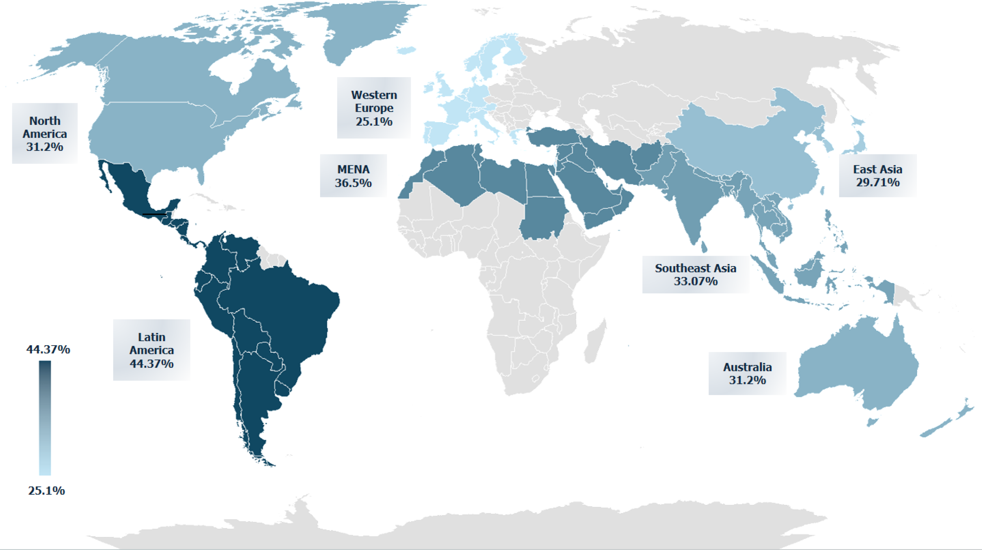 The map displays regional variation in metabolic dysfunction-associated steatotic liver disease prevalence, with the highest rates observed in Latin America (44.37%) and the Middle East and North Africa (MENA; 36.5%), followed by Southeast Asia (33.07%), North America (31.2%), and Australia (31.2%). Western Europe and East Asia show lower rates at 25.1% and 29.71%, respectively. These differences likely reflect a combination of genetic predisposition (e.g., PNPLA3 and TM6SF2 allele frequencies), dietary patterns, urbanization, and metabolic comorbidities[14].