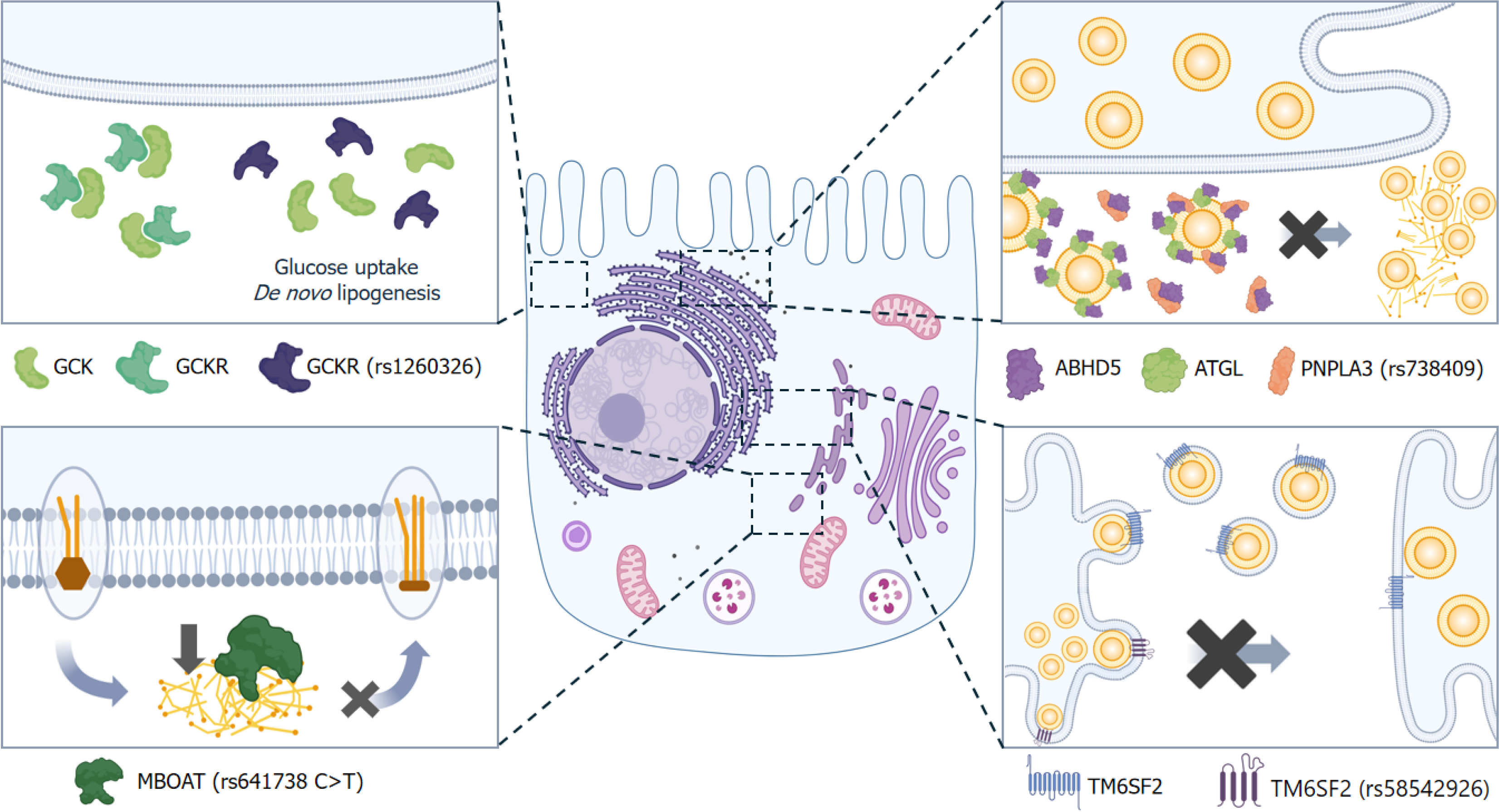 Figure 2 Schematic representation of intracellular pathways highlighting the key genes PNPLA3, TM6SF2, GCKR, and GCKR involved in susceptibility to metabolic dysfunction-associated steatotic liver disease development.