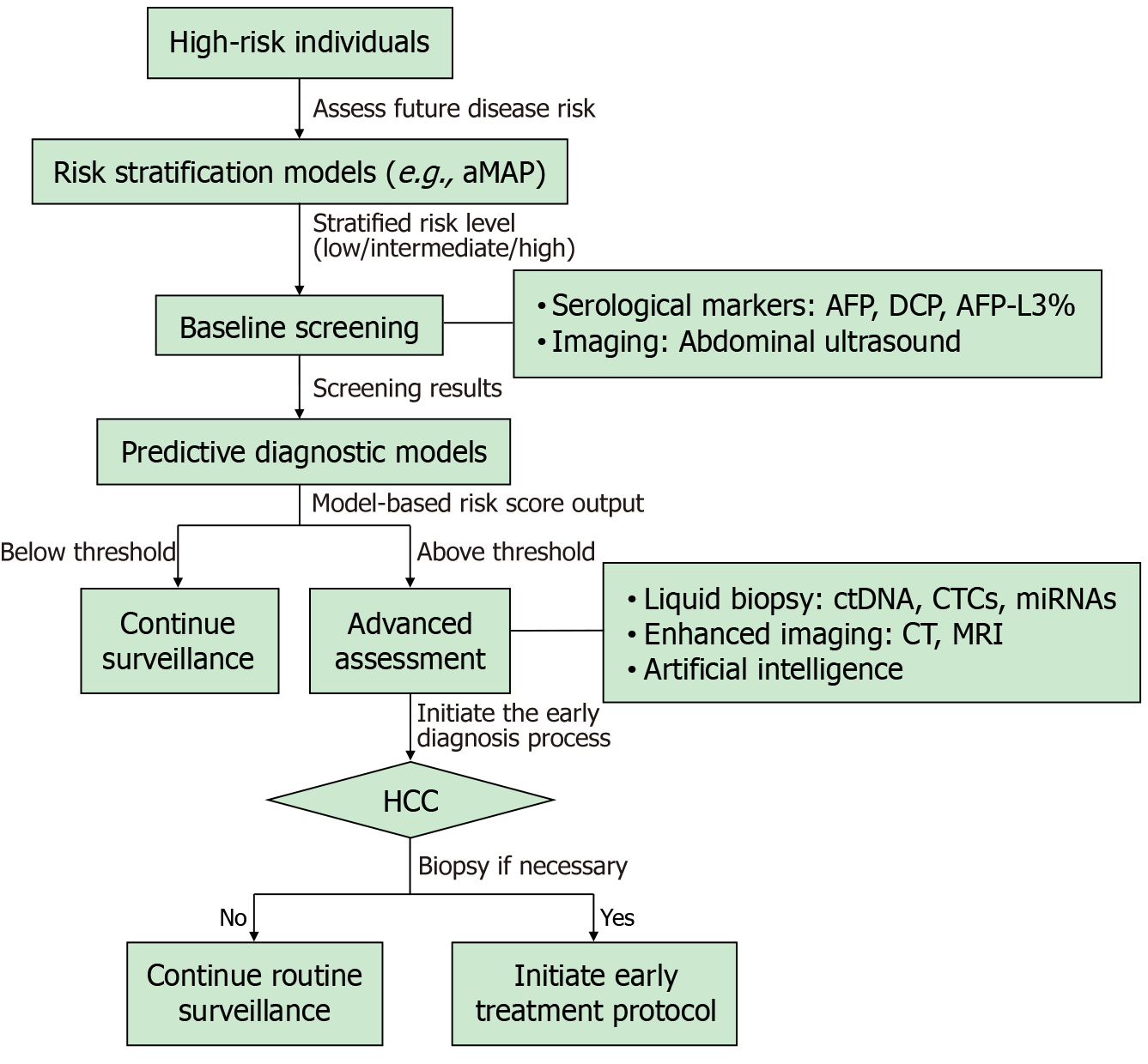 The prognosis of liver cancer is highly dependent on the stage at diagnosis. Early-stage lesions can be treated with curative therapy to extend survival. Over 60% of liver cancer patients diagnosed in Japan have early-stage HCC, and the 5-year overall survival rate for early-stage HCC patients who undergo curative treatment can be as high as 43%[5], which is significantly better than in China. The survival disparity between China and Japan directly reflects the gap in early diagnosis rates. Japan’s successful experience in early liver cancer screening offers valuable insights for adoption and adaptation[6]. HCC screening is crucial for early diagnosis, improving curative rates, extending patient survival, and enhancing long-term prognosis[7]. However, current liver cancer screening strategies face challenges in clinical application, such as low implementation rates and poor sensitivity in detecting early-stage HCC. Additionally, the rapid rise in metabolic-associated fatty liver disease has posed new challenges for traditional HCC screening methods[8-10]. To address these challenges, this paper comprehensively reviews the main technological advancements and challenges in early HCC screening, aiming to promote further development of early HCC screening efforts and improve survival rates and quality of life for HCC patients.