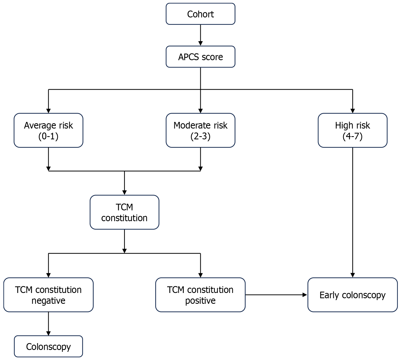 - Citation: Liu QH, Hou Y, Li S, Gu YL, Huang CX, Kang Q, Fan YJ, Zhu LQ, Sun L, Men RC, Li XY, Wang H, Wei XY, Sun ZG, He YQ. Risk scoring system combined with traditional Chinese medicine constitution identification improves colorectal advanced neoplasms screening effectiveness for early colonoscopy. World J Gastrointest Endosc 2025; 17(10): 108929