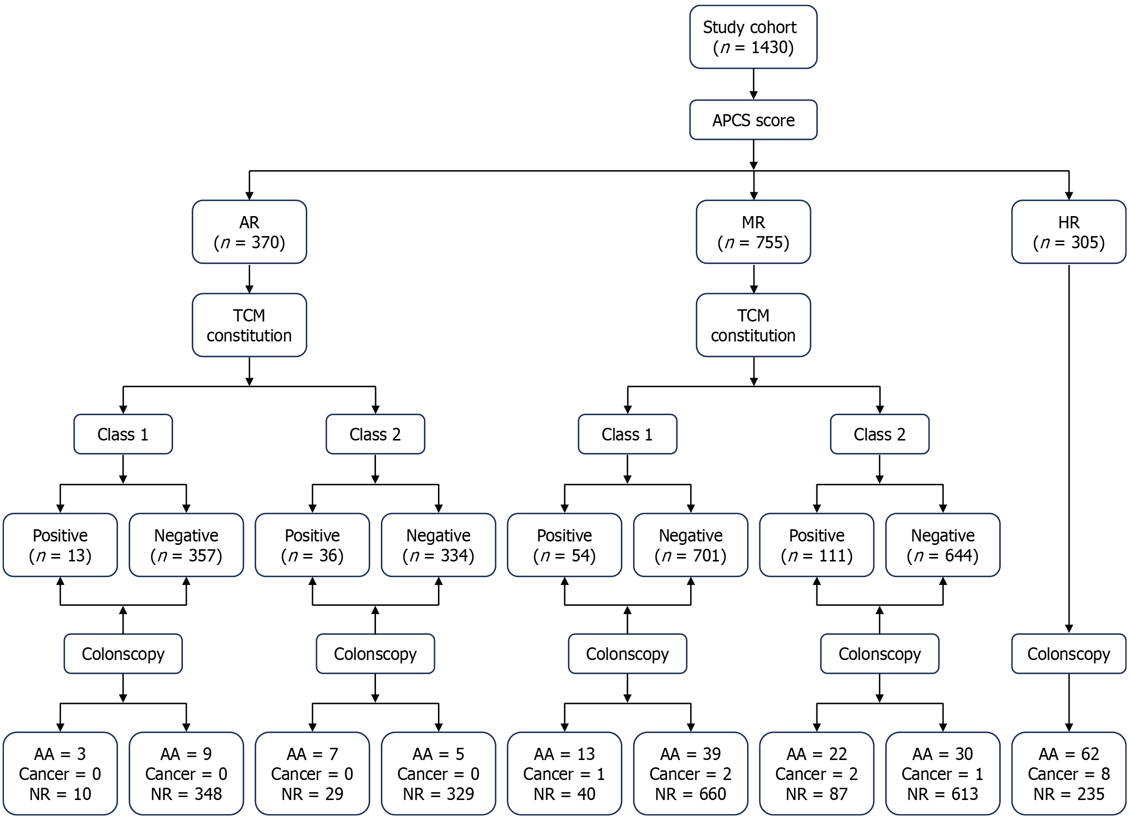 TCM: Traditional Chinese medicine; APCS: Asia-Pacific Colorectal Screening; AR: Average risk; MR: Moderate risk; HR: High risk; AA: Advanced adenoma; NR: Negative result.
