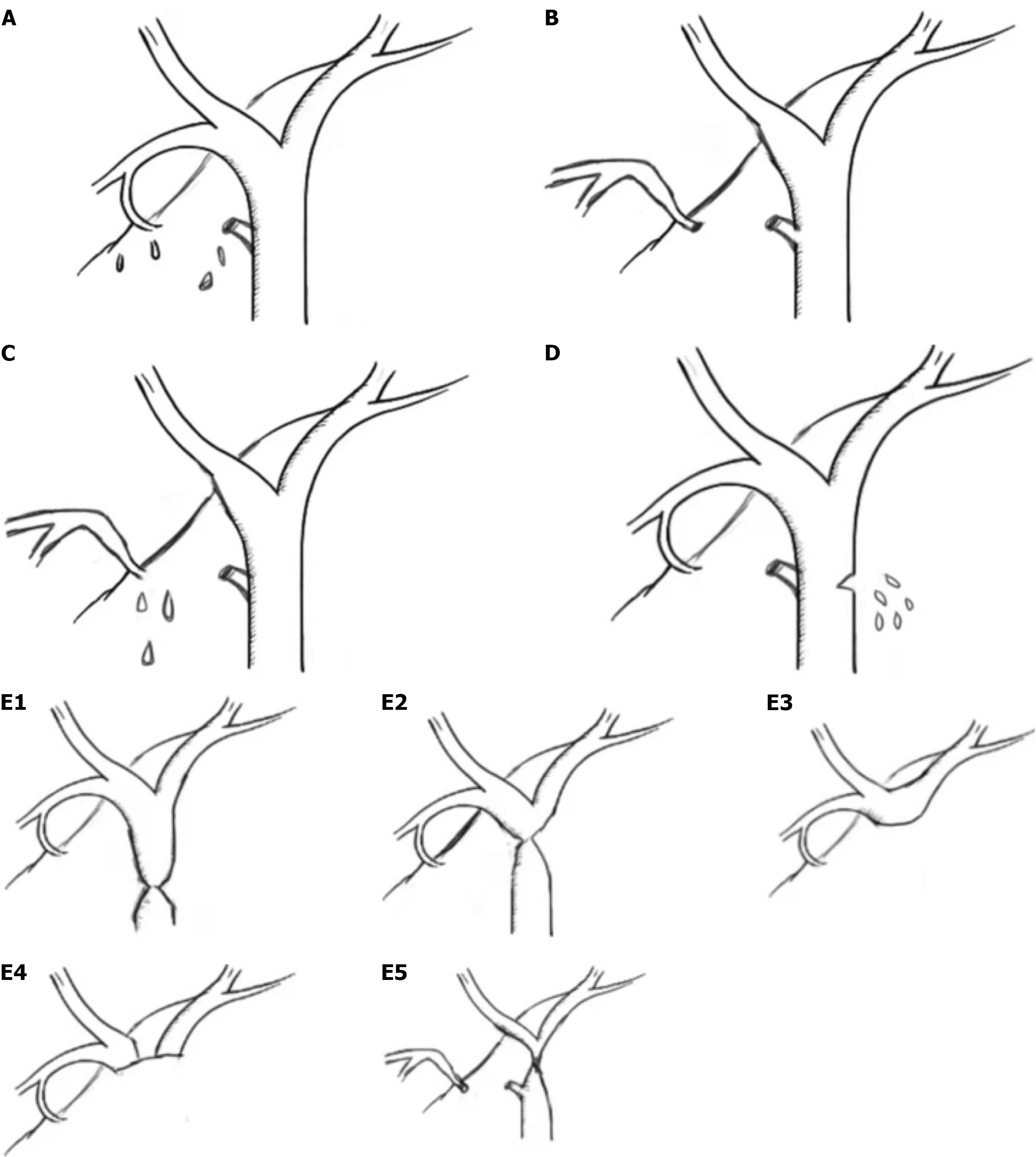 Type A: Bile leak from a cystic duct stump or Luschka’s duct; Type B: Occlusion of the right posterior sectoral duct; Type C: Bile leak from a transected right posterior sectoral duct; Type D: Bile leak from the main bile duct involving < 50% of its circumference; Type E1: Transection of the main bile duct with a stricture located > 2 cm from the hepatic hilum; Type E2: Stricture located < 2 cm from the hilum; Type E3: Hilar stricture with preserved communication between the right and left hepatic ducts; Type E4: Hilar stricture with complete separation of the right and left hepatic ducts; Type E5: Combined stricture involving the main bile duct and the right posterior sectoral duct. Types E1-E5 correspond to Bismuth types I-V.