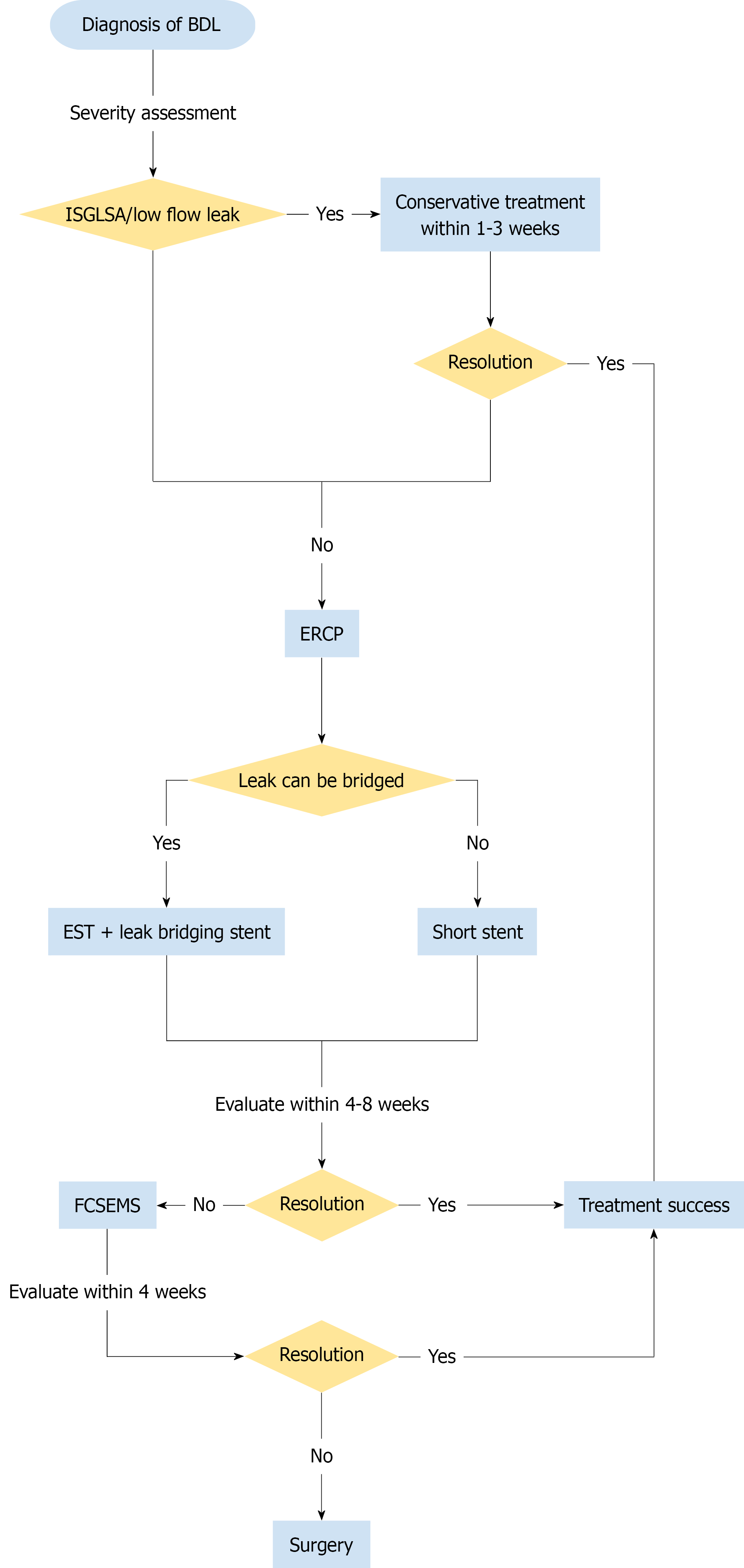BDL: Bile duct leak; ERCP: Endoscopic retrograde cholangiopancreatography; EST: Endoscopic sphincterotomy; MPS: Multiple plastic stents; FCSEMS: Fully covered self-expandable metal stents.