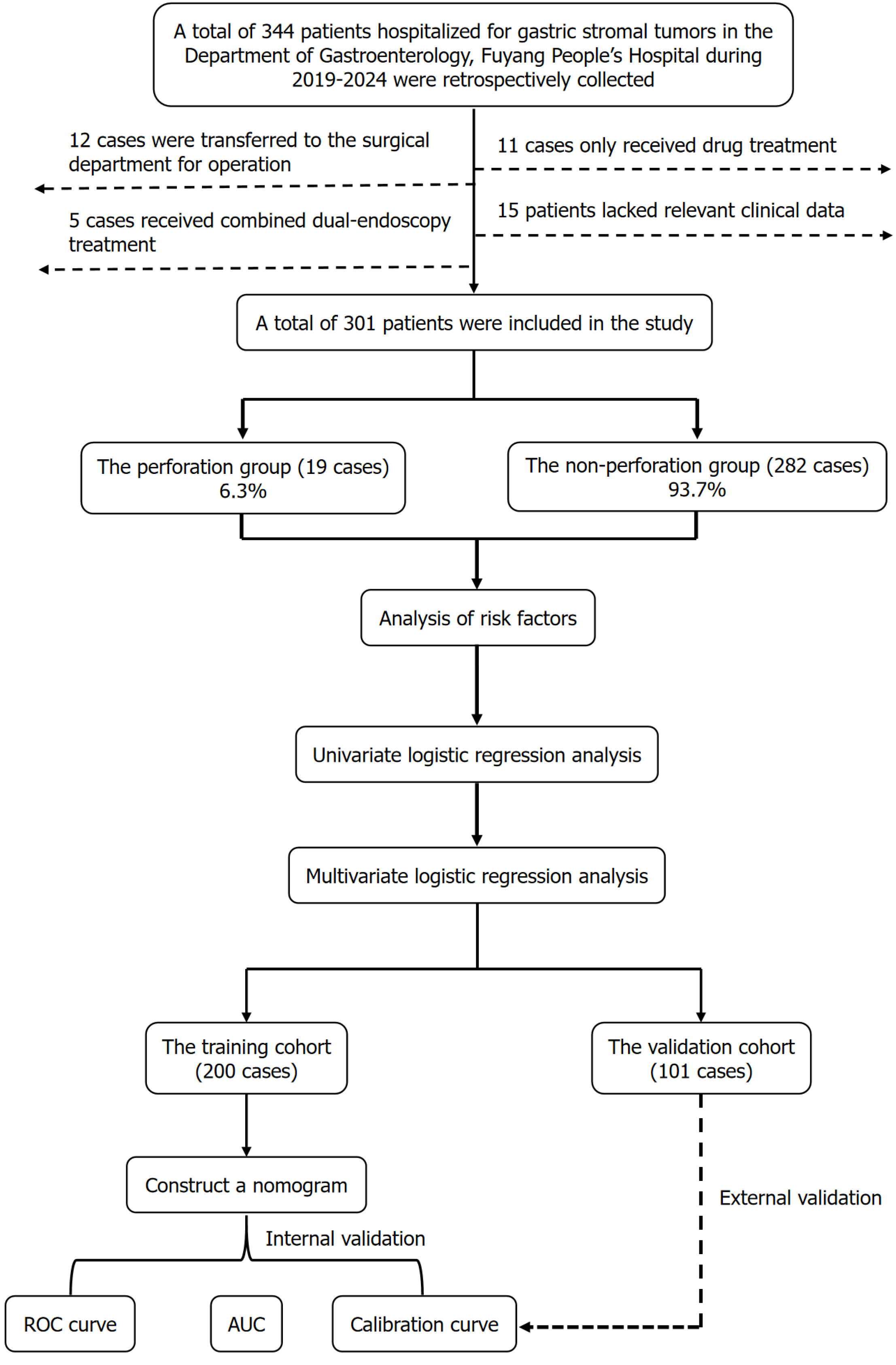 - Citation: Zhang DM, Li PP, Zhang MH, Zhao ZX, Zhou YB. Postoperative perforation risk after endoscopic removal of gastric gastrointestinal stromal tumors: Development and validation of a predictive nomogram. World J Gastrointest Endosc 2025; 17(10): 110920