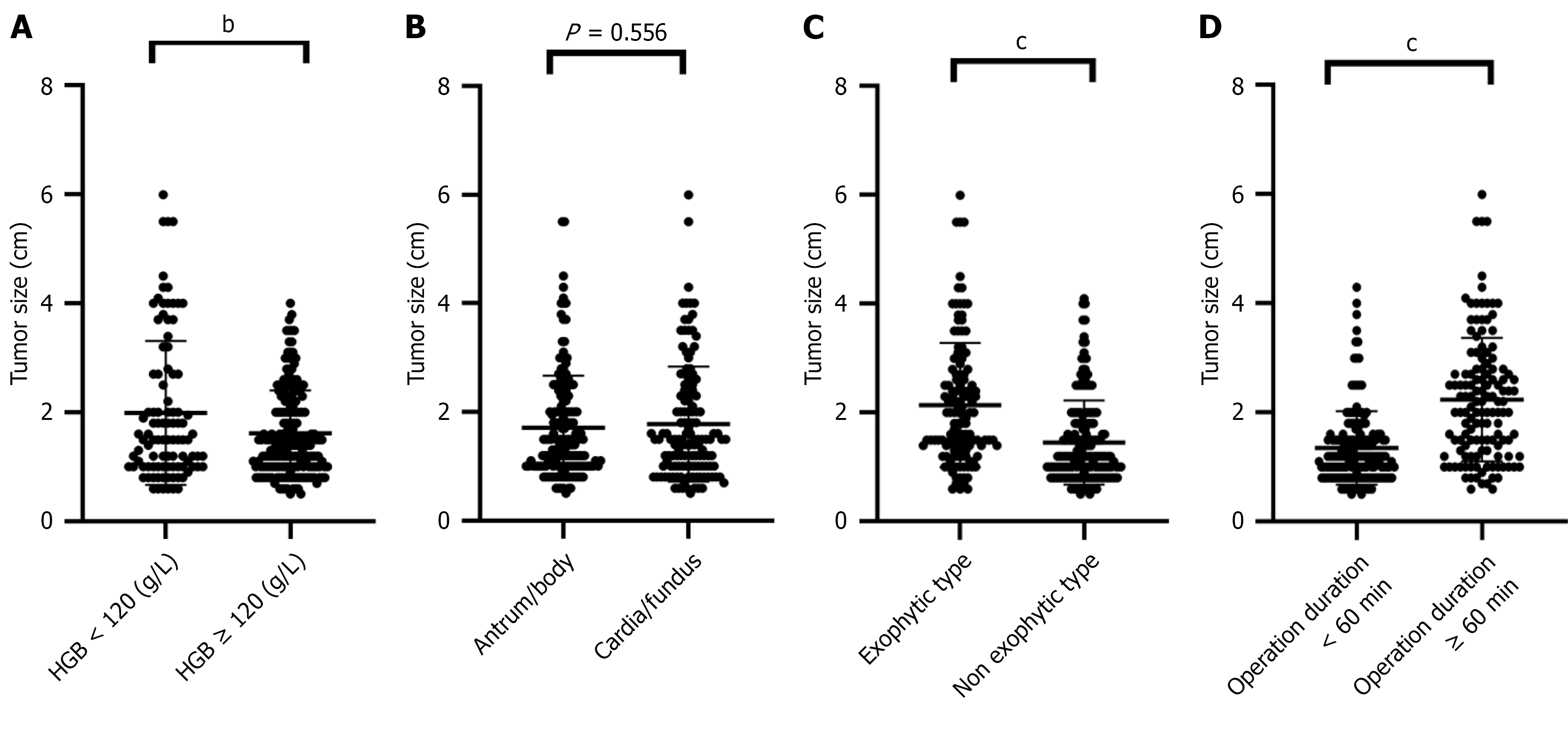 A: Tumor size was larger in patients with lower hemoglobin levels compared to those with higher hemoglobin levels; B: Tumor size between different locations (antrum/body vs cardia/fundus) was not statistically significant; C: Tumor size was larger in the exophytic type compared to the non-exophytic type; D: Longer operation duration was related to tumor size. bP < 0.01; cP < 0.001. HGB: Hemoglobin.