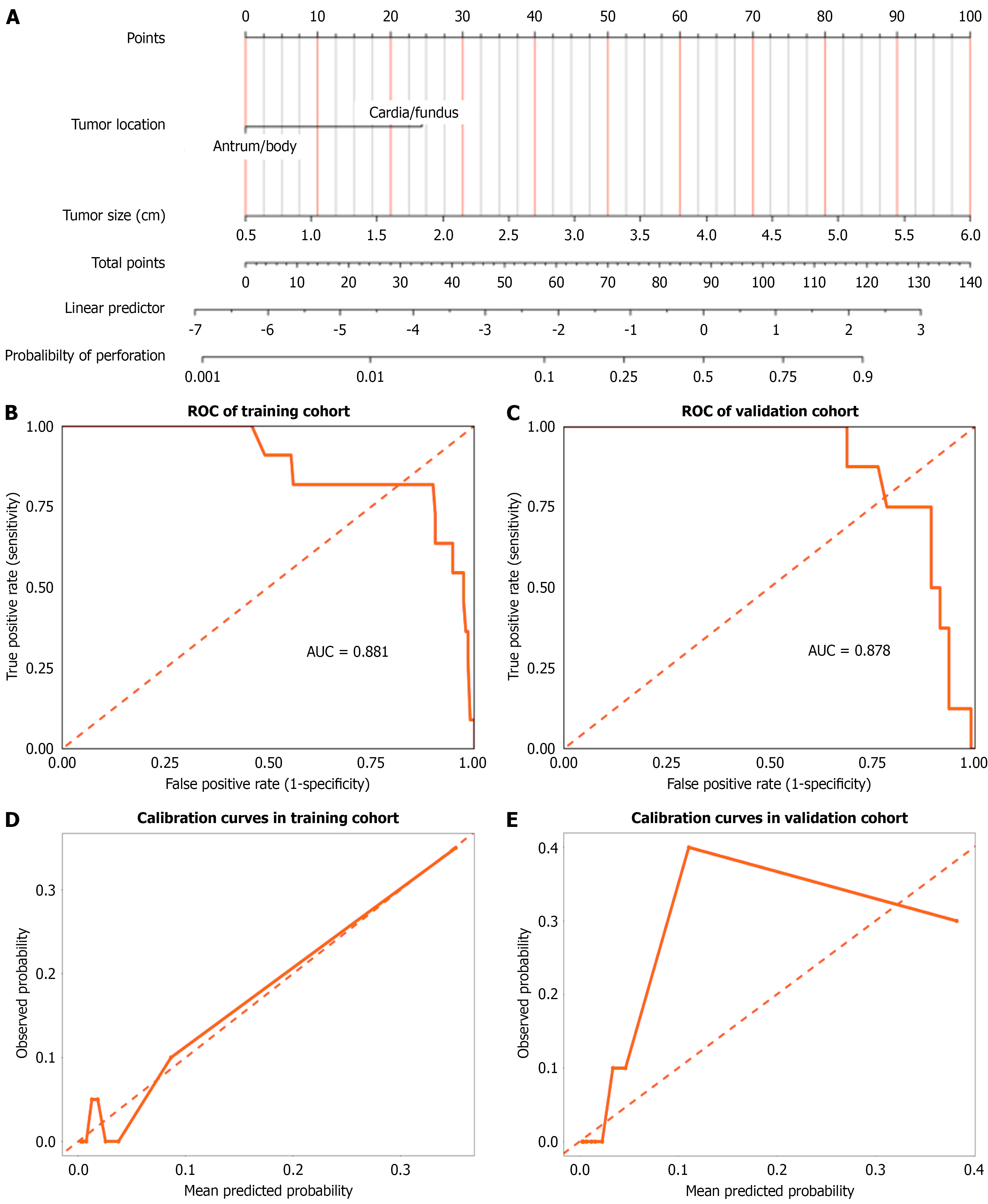 A: Nomogram depicting the contribution of key variables (tumor location, tumor size) to the predicted probability of perforation after endoscopic resection; B: Receiver operating characteristic curve for the training cohort. The area under the curve was 0.881; C: Receiver operating characteristic curve for the validation cohort (area under the curve = 0.878); D: Calibration curve for the training cohort; E: Calibration curve for the validation cohort. ROC: Receiver operating characteristic; AUC: Area under the curve.