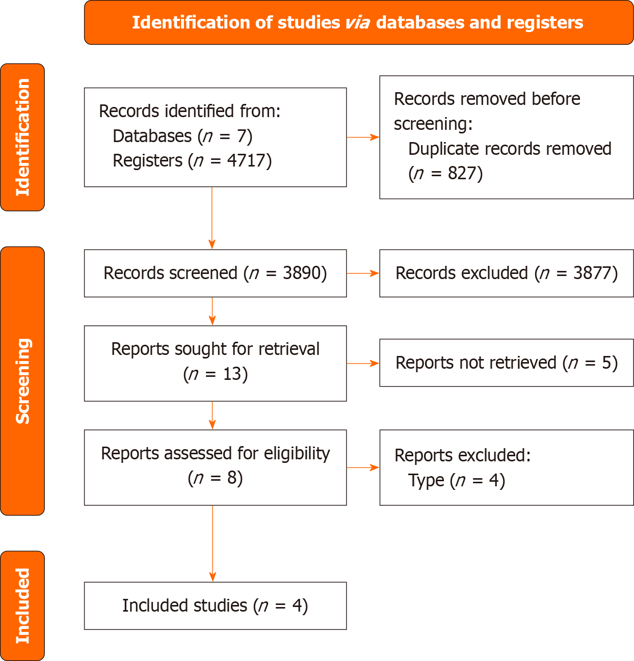 Description: The Preferred Reporting Items for Systematic Reviews and Meta-analyses flow diagram summarizes the selection process for the studies included in the systematic review. A total of 4717 articles were identified through database searches. After removing duplicates, 3890 articles underwent title and abstract screening. Of these, 13 articles were selected for full-text review, and 4 articles met the inclusion criteria for the final analysis. Refer to the Preferred Reporting Items for Systematic Reviews and Meta-analyses statement for further details.