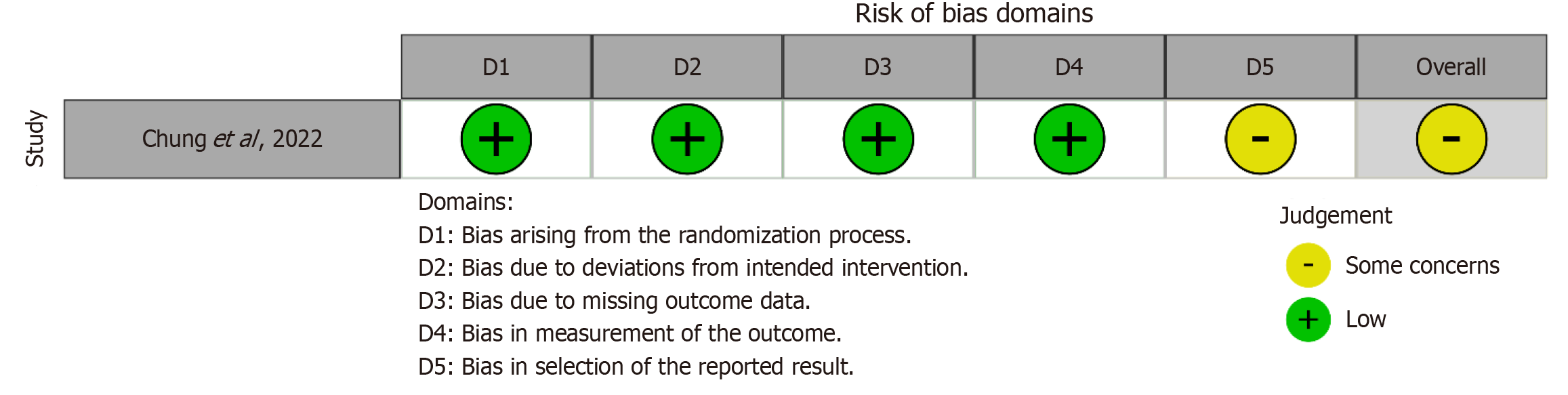 Traffic-light plot of risk-of-bias assessment using the Cochrane Risk of Bias 2.0 tool, evaluating five domains.