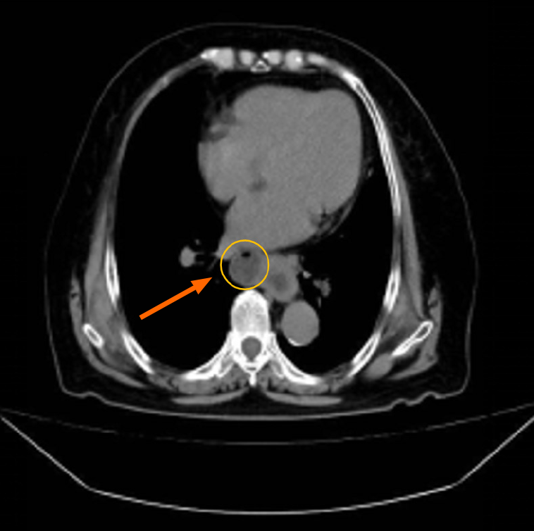 The cystic bulge on the right side of the middle esophagus was considered an esophageal diverticulum, and local thickening of the lower esophagus was observed.
