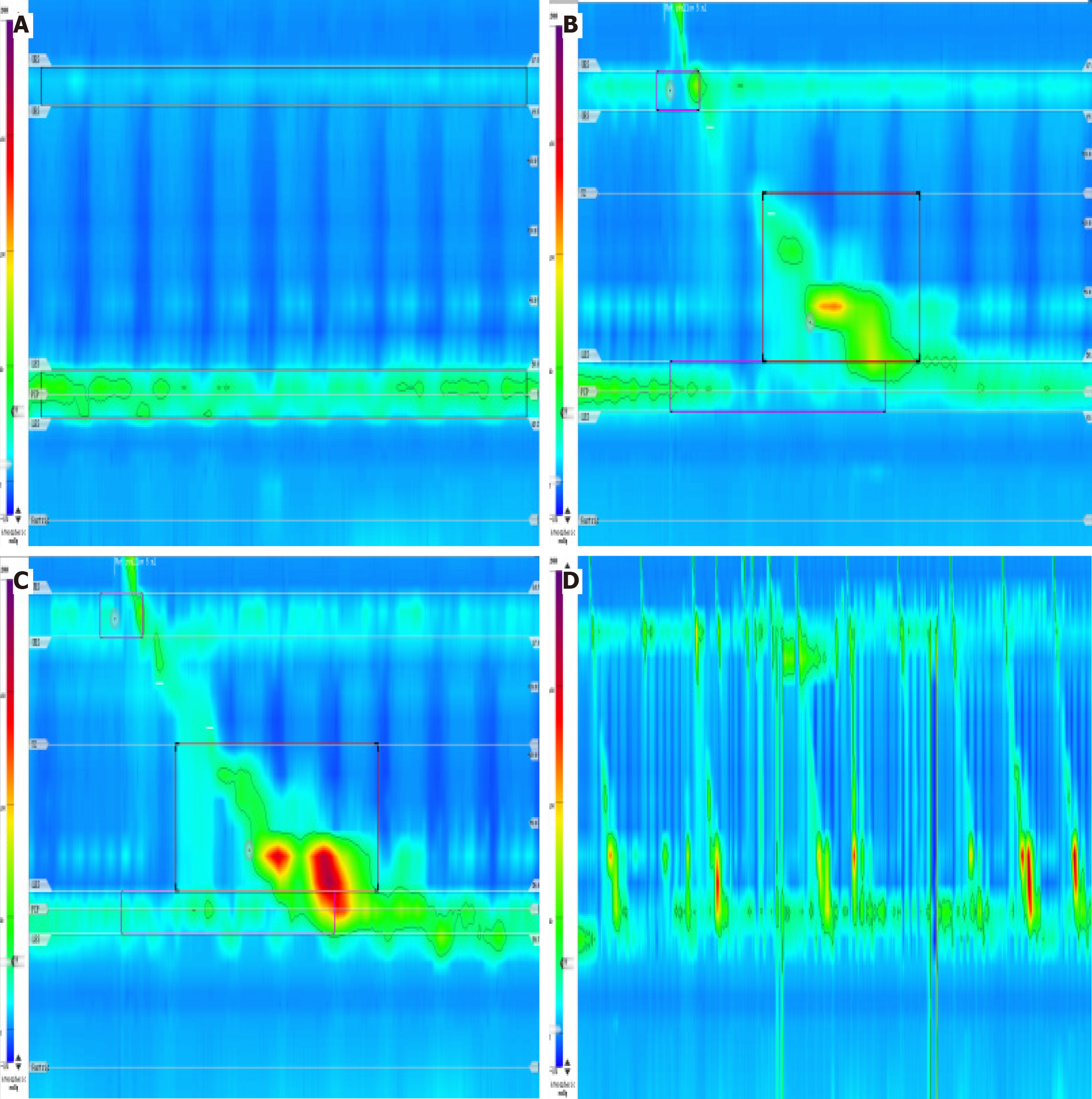 A: Static pressure: At rest, the upper esophageal sphincter pressure was low (8 mmHg in this patient, normal value 33-180 mmHg) and the low esophageal sphincter pressure was normal (27 mmHg in this patient, normal value 10-45 mmHg); B: 5 mL wet swallow: While normal 4s integrated relaxation pressure and normal distal contractile integral suggest normal peristalsis in the body of the esophagus, an interruption of the contraction wave on the 20 mmHg isobaric line with a defect length greater than 5 cm (6.5 cm) suggests segmental contraction; this swallow was ineffective; C: 5 mL wet pharynx: Normal 4s integrated relaxation pressure, normal distal contractile integral, distal latency, and maximal interruptions are in the normal range, suggesting normal esophageal motility; D: Comprehensive analysis: The patient performed 10 5-mL wet swallows, with 6 (60%) normal contractions (450 mmHg.s.cm < distal contractile integral < 8000 mmHg.s.cm) and 6 (60%) ineffective swallows (including 2 peristaltic failures, 2 weak contractions, and 2 fragmentary contractions). This suggests an indeterminate ineffective esophageal motility. Performed 3 multiple rapid swallows, with the distal contractile integral after performing multiple rapid swallows being less than the mean distal contractile integral of a single swallow, suggesting poor esophageal contractile reserve function.